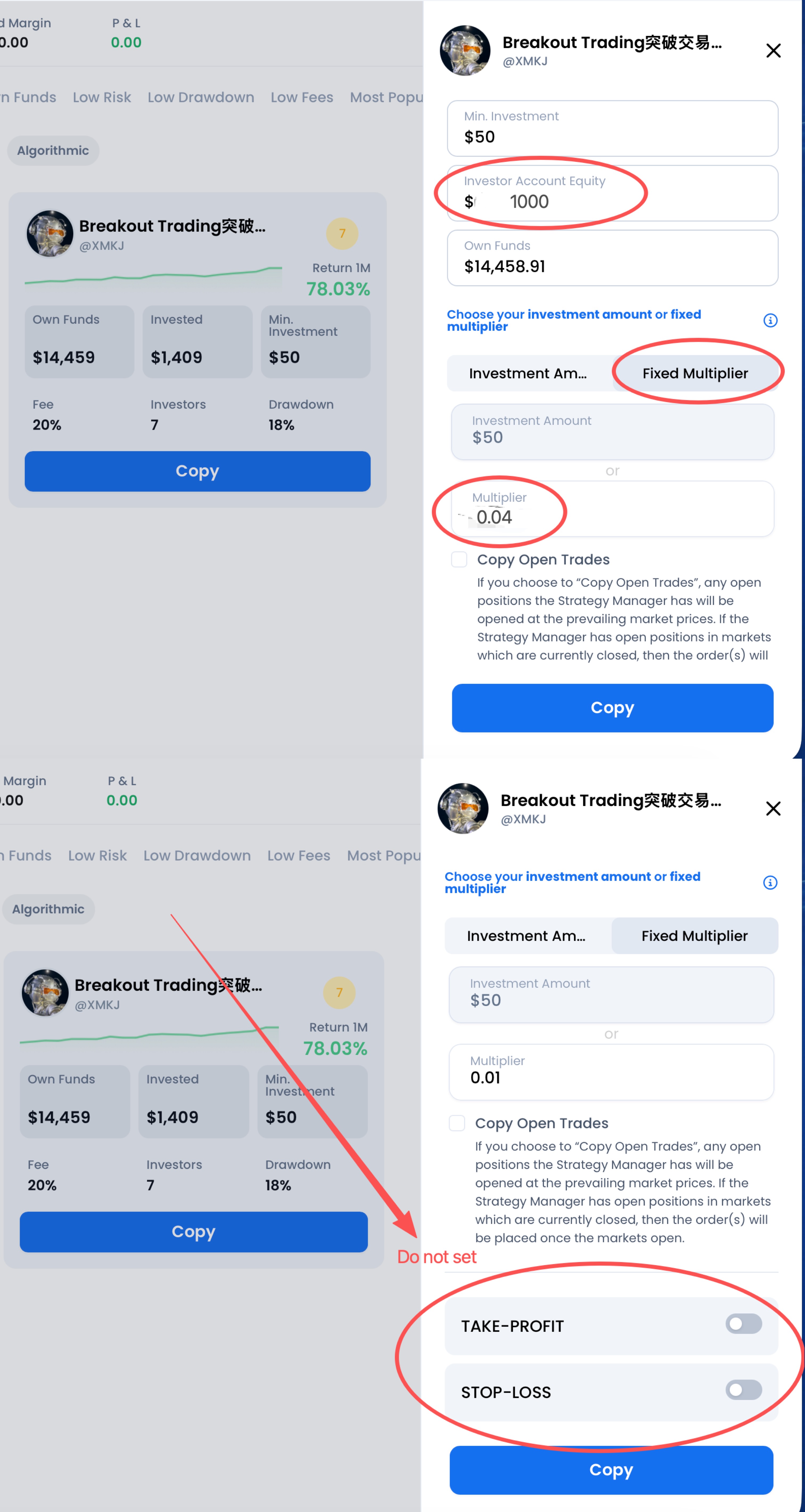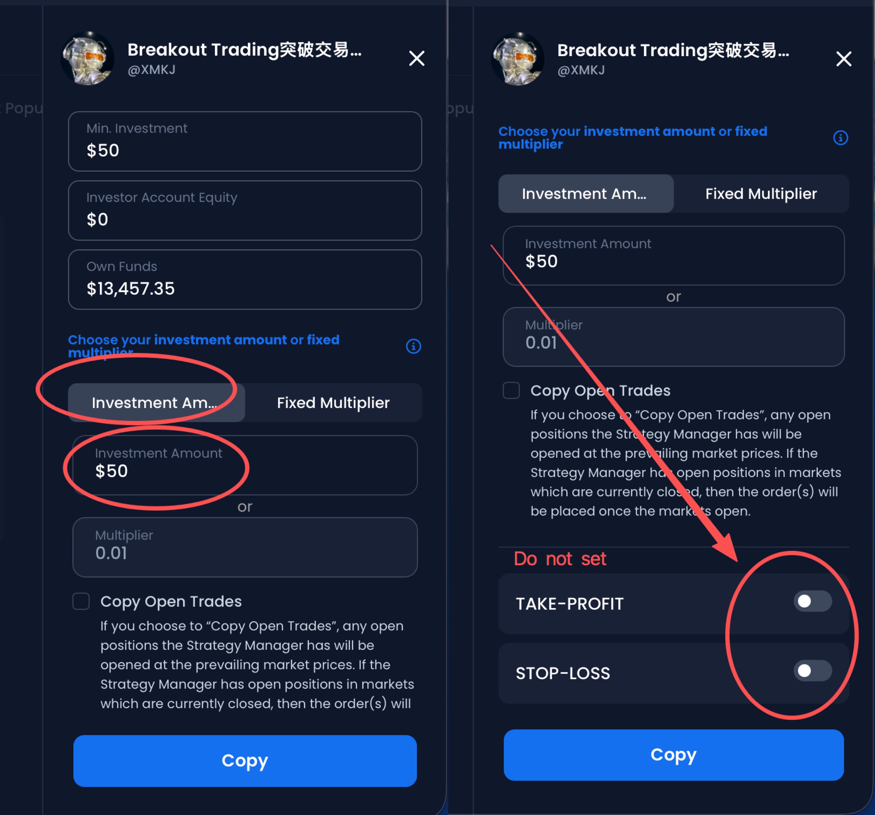订阅XM平台并设置复利跟单交易(如图)即可开始复利交易。最低投资仅需50美元!选择您的投资金额: 如果您投资50美元并选择复利交易,我的账户目前有13,457美元。如果我交易 0.1 手,那么您的订单将是 0.0037 手(投资者账户的最小交易单位为 0.001 手)。