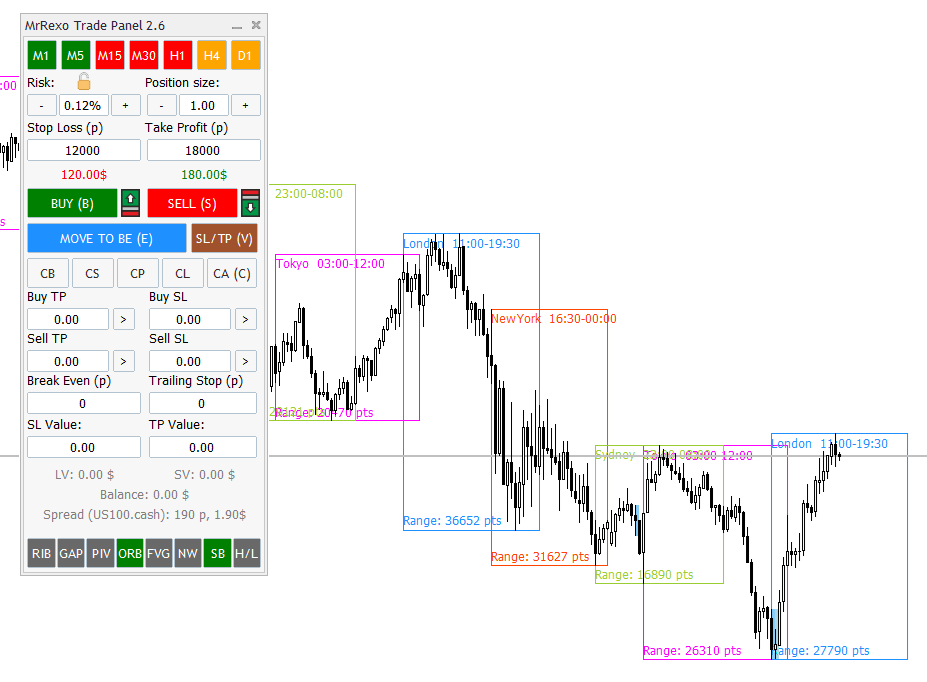 Track global market sessions with customizable Sydney, Tokyo, London and New York ranges. The built-in ORB module also highlights opening ranges for London and New York.