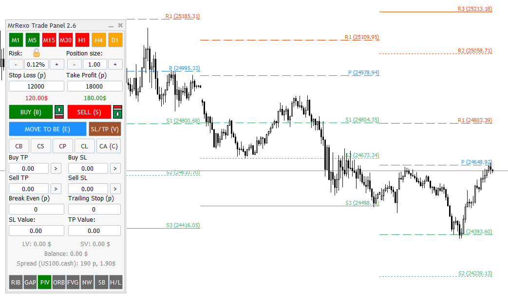 Keep key price levels visible at all times. MrRexo Trade Panel supports Floor, Woodie, Camarilla and Fibonacci pivots, plus Daily High and Daily Low tracking.