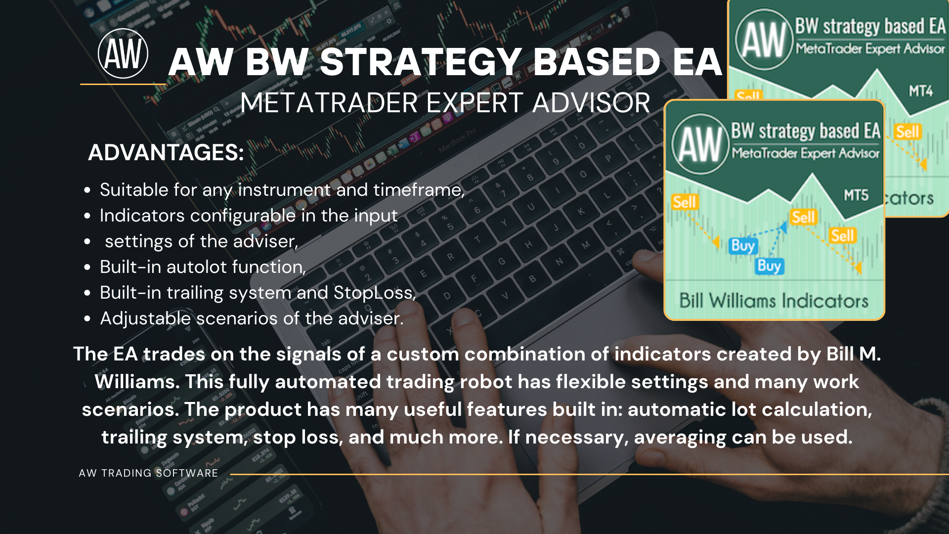EA trades on the signals of a custom combination of indicators created by Bill M. Williams. This fully automated trading robot has flexible settings and many work scenarios. The product has many useful features built in: automatic lot calculation, trailing system, stop loss, and much more. If necessary, averaging can be used.