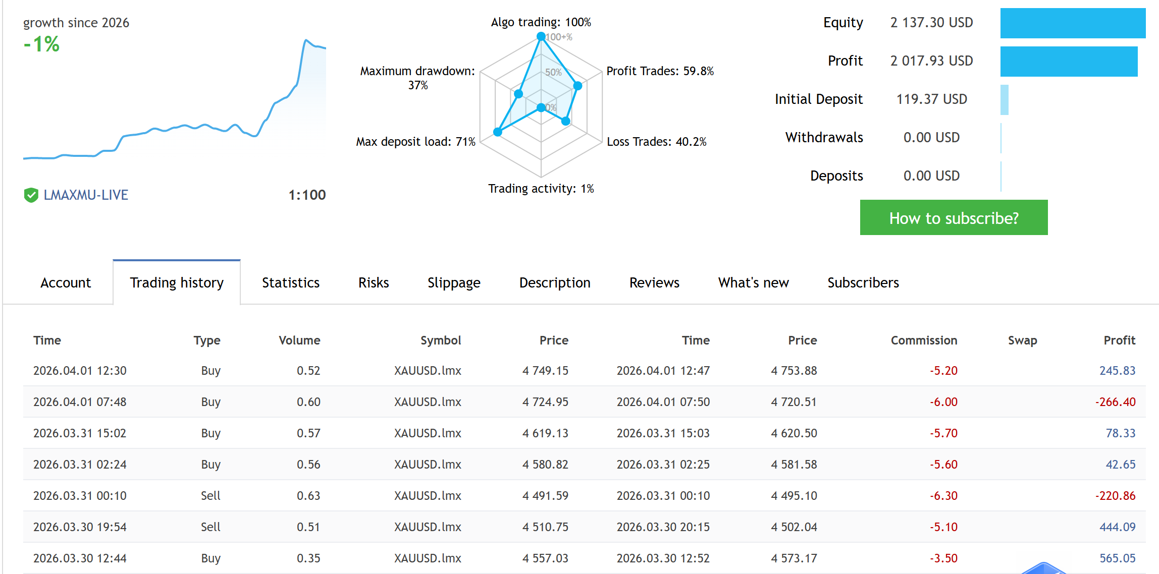 The signal : Gold V3 LMAX 119 10P HR testing 2026-4-1, the percent of growth on this account is wrong suddenly today. and it should be around 2000% , as there is no other new depoist or withdrawal , it looks clear , no matter how, this account began from 119 usd.