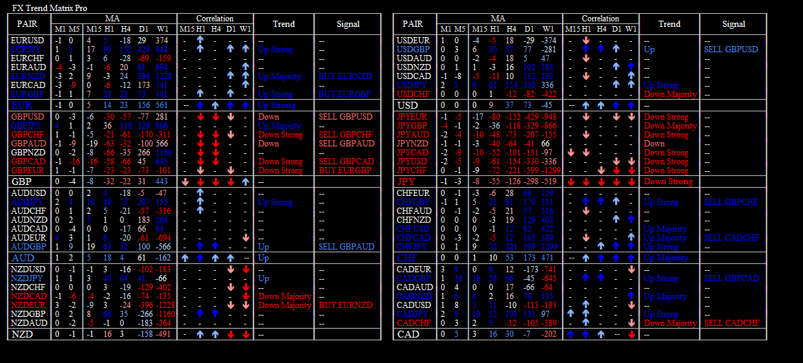 FX Trend Matrix Pro Your all-in-one multi-symbol trend, correlation, and signal analysis system. 🧭 Overview FX Trend Matrix Pro is a professional multi-symbol dashboard that combines trend direction, currency correlation, and signal detection into one structured matrix view. Instantly see how trends align across symbols and timeframes — revealing the strongest trading opportunities in real time. ⚙️ Key Features 📊 Multi-timeframe trend matrix (M1–W1) 🔗 Currency correlation mapping (positive