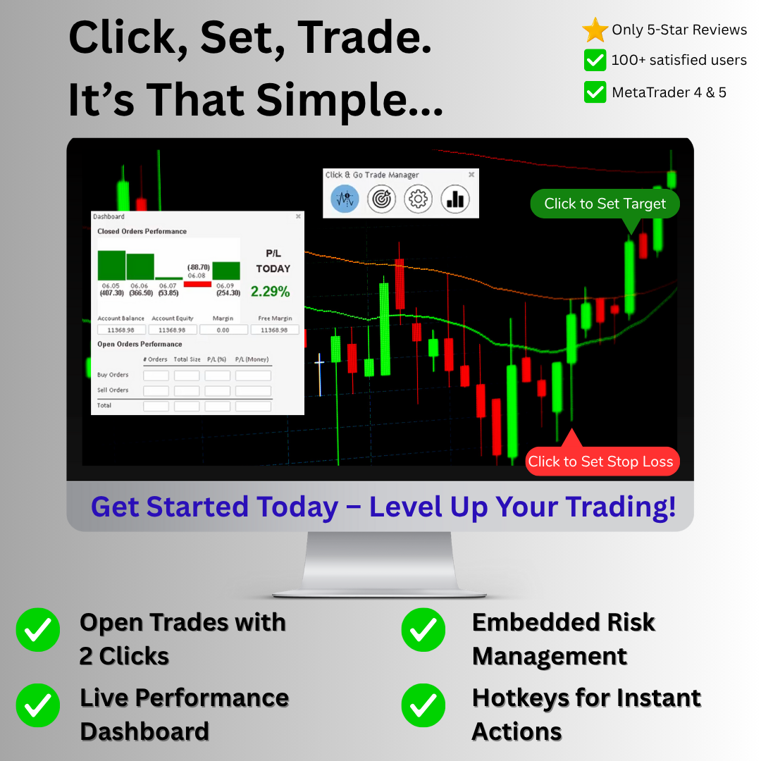 The Click and Go Trade Manager makes it super easy to place and manage trades and comes with a dashboard to see your trading performance.