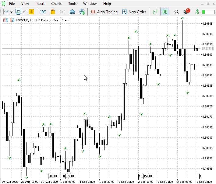 アルゴリズムは意図的に簡潔かつ決定的です。確定バーから信頼できるフラクタル支点を検出し、終値がその支点を明確に越えたときのみ判定し、一度確定した突破には一回だけ印を付けて描画し、一件のログと通知だけを生成します。この確定バー方式により、リペイントの発生を避け、再現性と検証性を備えたシグナルを生成できます。- 高レベルの流れ
