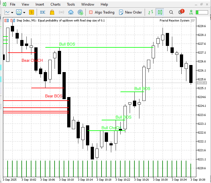 過去のバックテスト(EURUSDおよびStep Index、H1時間足)およびリアルタイムテストの両方において、フラクタルベースの検出器は設計通りに動作しました。フラクタルピボットは安定した非リペイント型のアンカーを提供し、ChoCH警告はバイアス喪失を早期に示し、BOS確認は構造変化を確実に通知しました。バックテストでは、注釈付きGIF(警告から確定までのシーケンス)と一致する一貫したトレードイベントが生成され、リアルタイムスクリーンショットでも同様のパターンが確認され、実市場特有の影響(スプレッドやスリッページ)のみがログに現れました。