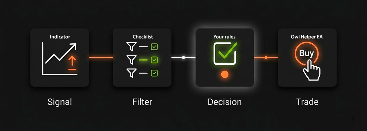- Owl Helper Expert Advisor は執行と管理をサポートします。ただし、最終的な判断は常にトレーダー自身が行います——システムはそれを整理するためのものです。