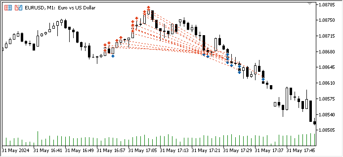 起動時には、標準的な方法で表示される履歴は非表示になっており、最後にクローズされたポジションのみが表示されていました。Ctrlキーを押しながらカーソルキーを押すと、ポジションの履歴を移動できます。クローズされたポジションのリストを移動しながら、ここでクローズされたポジションのすべての取引のラベルがチャートに表示された場所で、取引履歴のグラフィック表現を簡単に見ることができます。