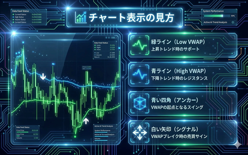 通常のVWAPは時間が経つと価格から離れてしまい、サポート・レジスタンスとして機能しなくなります。またTradingView版はリペイント(過去シグナルが後から変わる)という問題があります。このMT4版ではどちらの問題も解決しています。