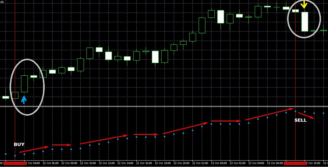 Если новый шар закроется в свече выше предыдущего шара, то сигнал на buy (появляется в новой свече стрелка вверх), при условии что ранее не было сигнала на buy.