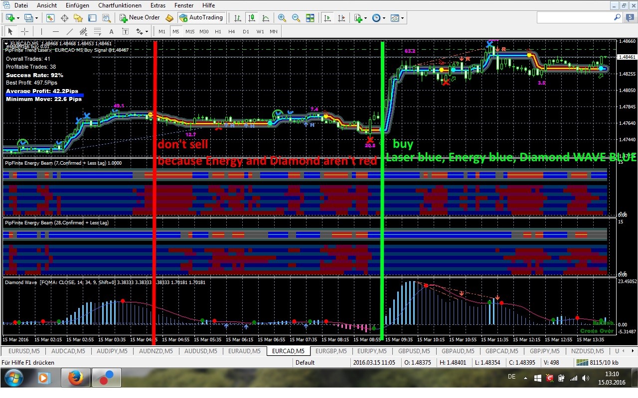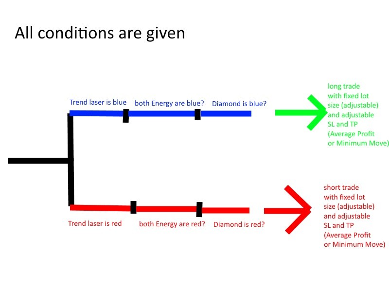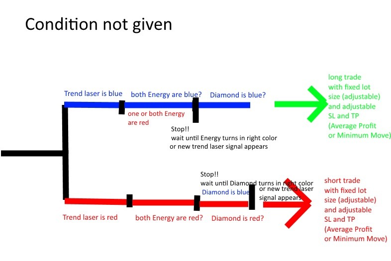 If only one conditions not given (one or both energy beam don't have the same color and/or Diamond hasn't the same color) the EA should wait until the conditions are given or a new trend laser signal appears.