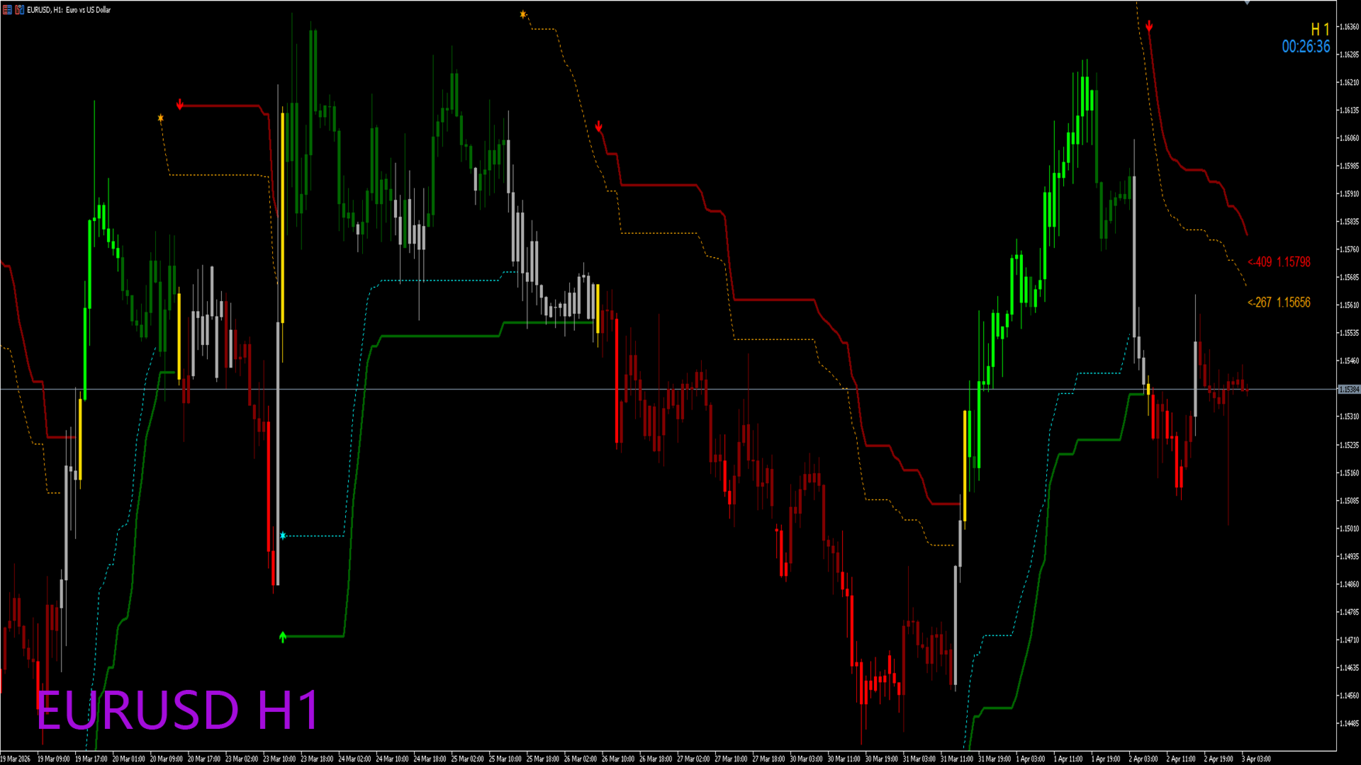 The OV-VCS_ATR indicator consists of a line plotted on the price chart, which changes color to indicate the trend direction: