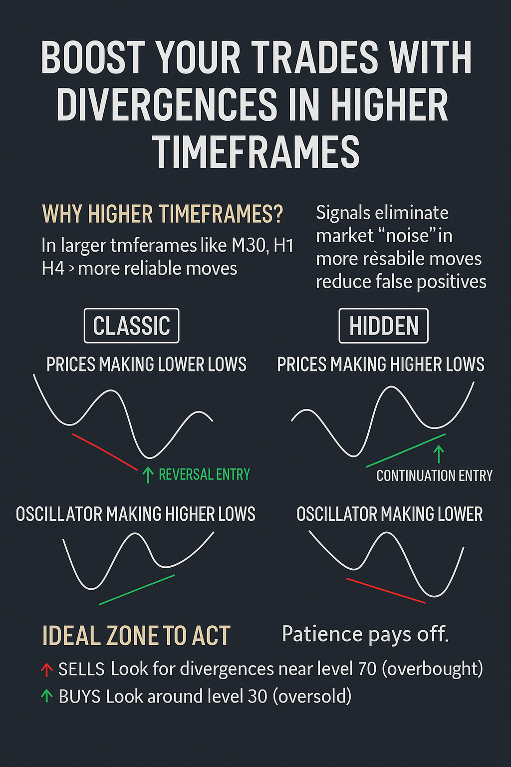 - Hidden Divergence → Confirms trend continuation after pullbacks. Ideal for entering trades aligned with the main trend.