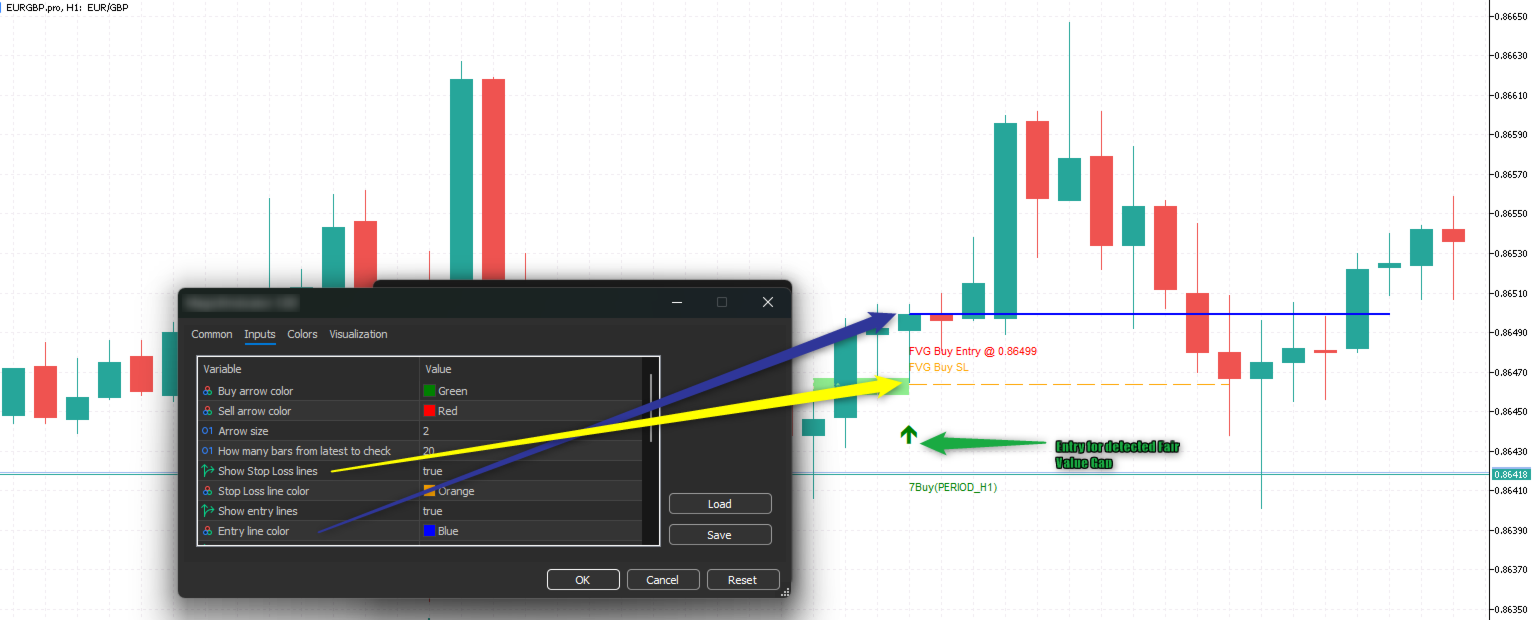 - FVGTransparency: FVG rectangle transparency 0-100 (default: 70)
