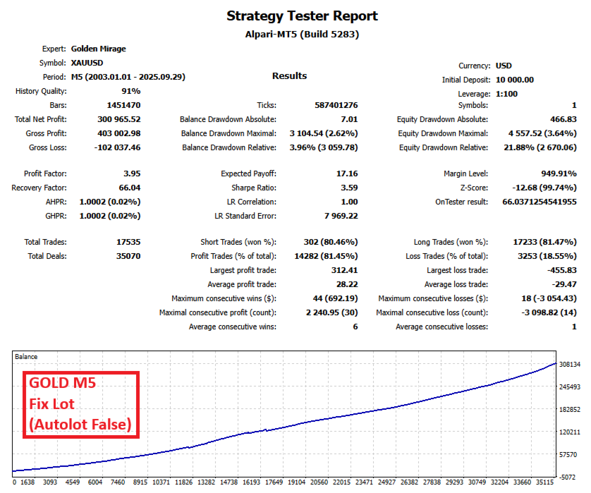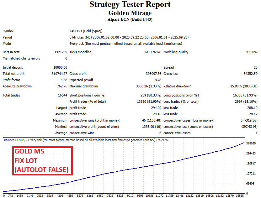 Golden Mirage is a robust gold trading robot designed for traders who value reliability, simplicity, and professional-grade performance. Powered by a proven combination of RSI, Moving Average, ADX, and High/Low Level indicators, Golden Mirage delivers high-quality signals and fully automated trading on the M5 timeframe for XAUUSD (GOLD).