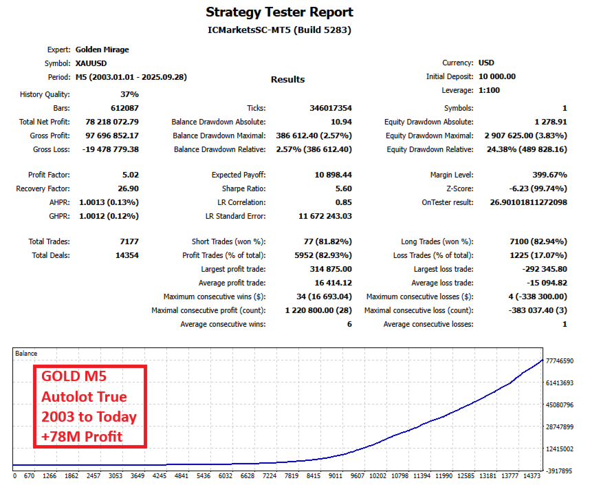 Thank you Michela, Golden Mirage is doing a great job on backtests, profitable and reliable, loving the 5m on xauusd and the potential for prop firm automating. installing on a live demo account so will see how that goes. I'll be back.