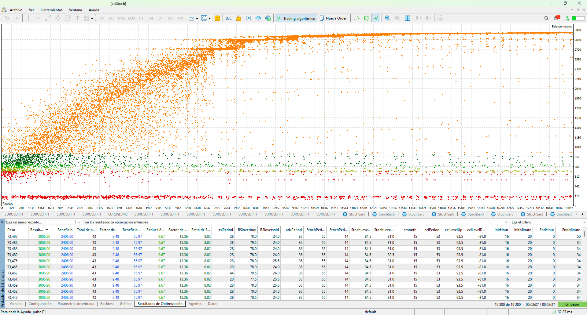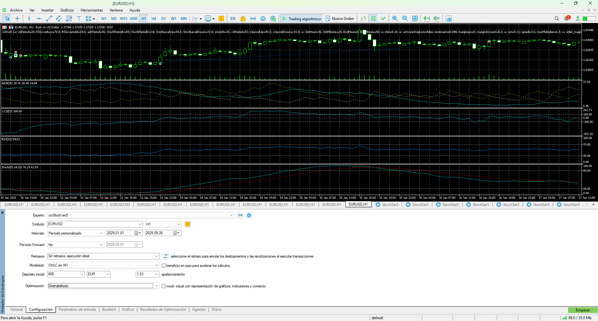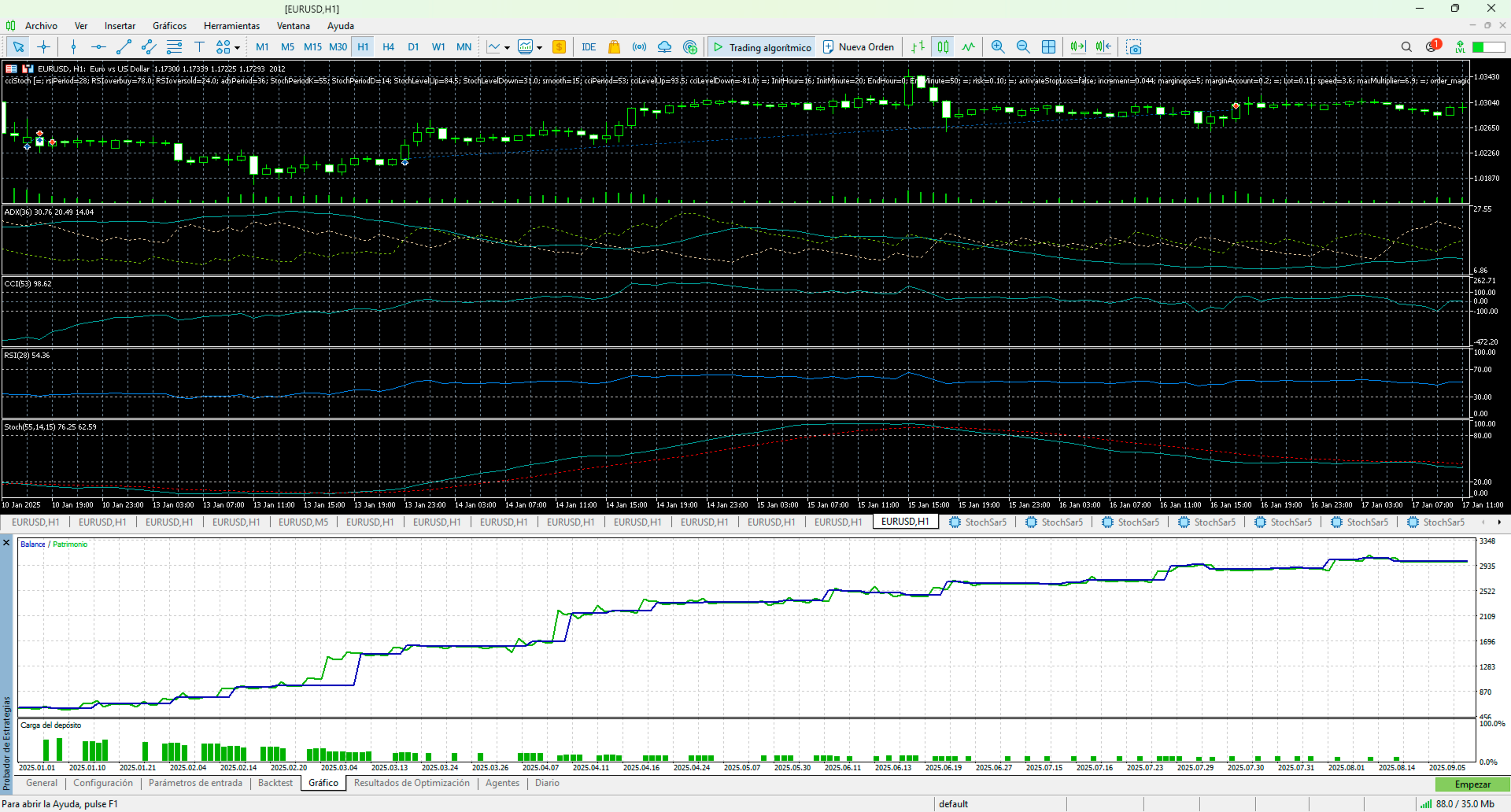 An Expert Advisor that operates in times of high contrast, employing the stochastic indicator and the commodity index indicator, using overbought or oversold points or the ADX indication to exit trades. It also features a stop-loss control that operates on a percentage difference in price, with progressive lot scaling as the balance increases, while keeping an eye on the account's margin call.