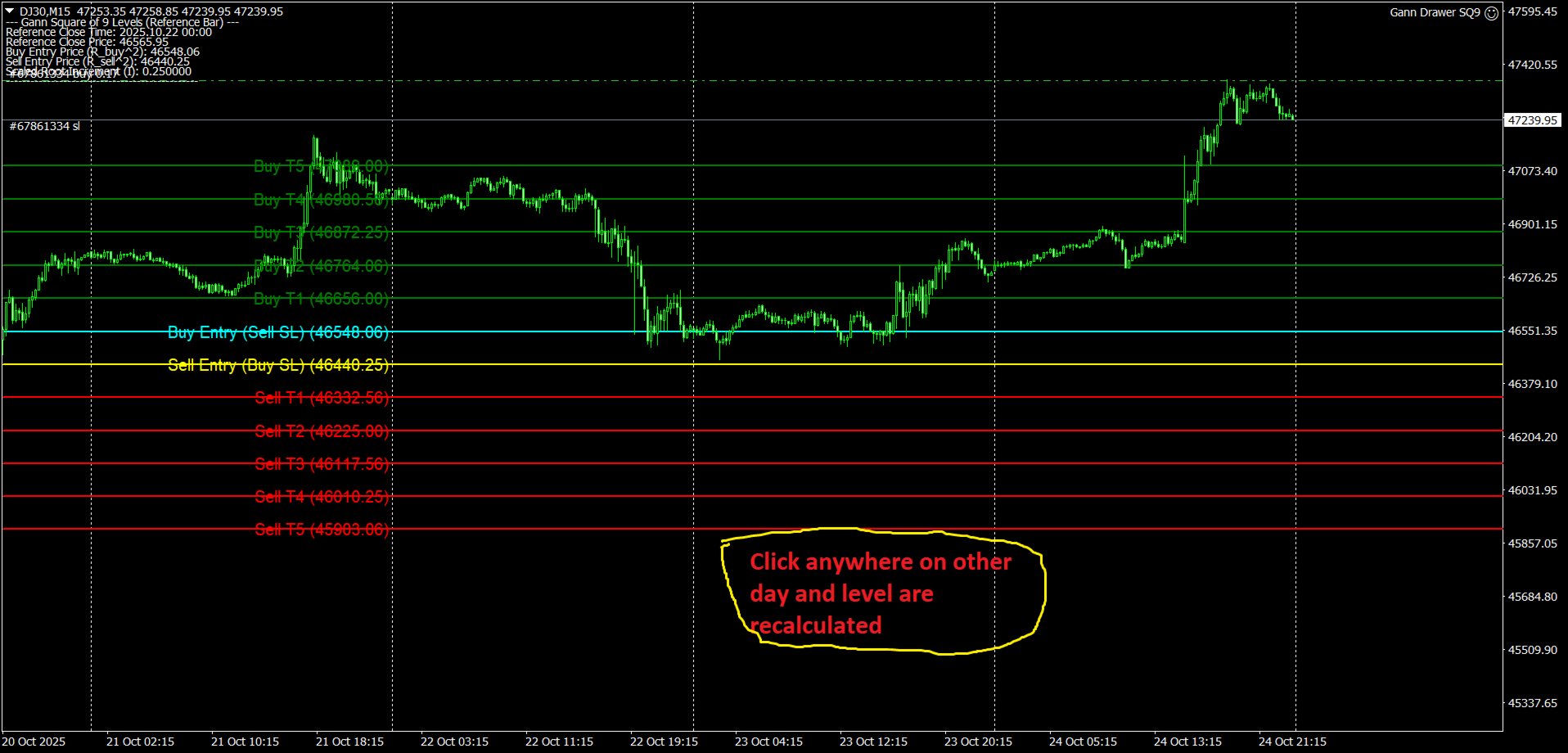 This Expert Advisor (EA) turns Gann’s Square of 9 method into a dynamic and interactive trading tool. It automatically calculates and draws key amazing accurate support and resistance levels on your chart all based on a point in history that you choose by just clicking on the chart.