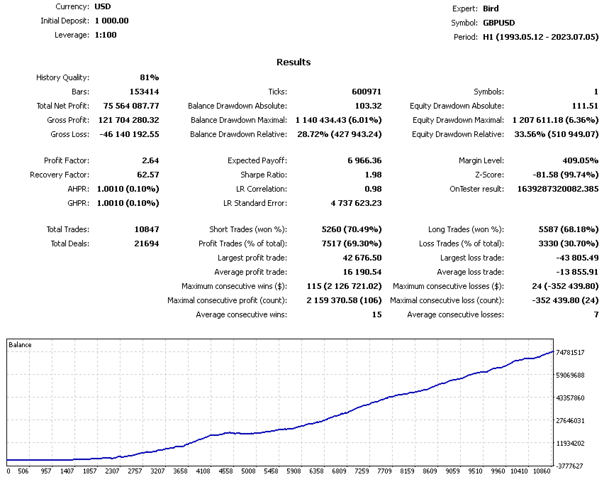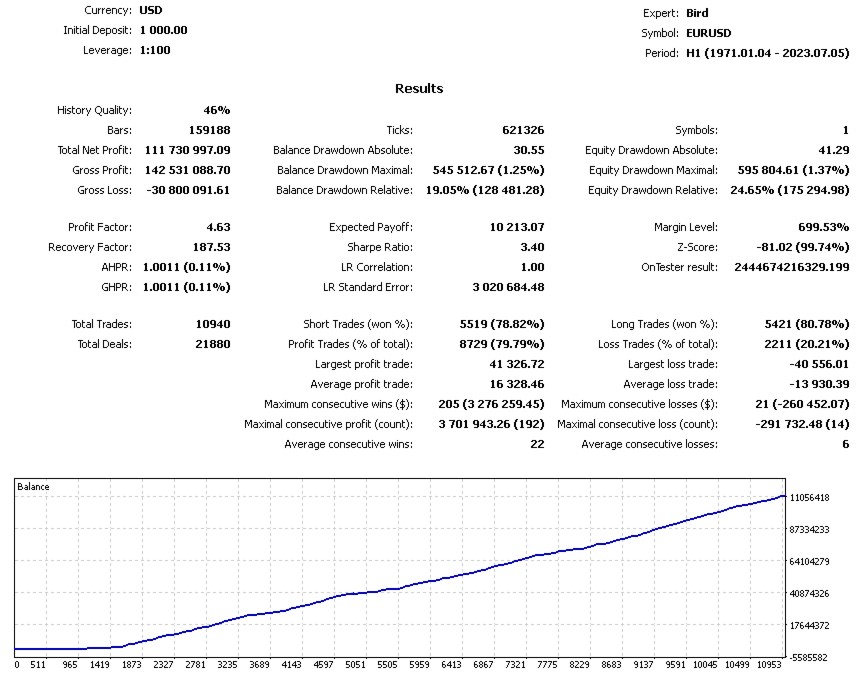 Works with different currency pairs on the H1 timeframe, leverage 1:100.