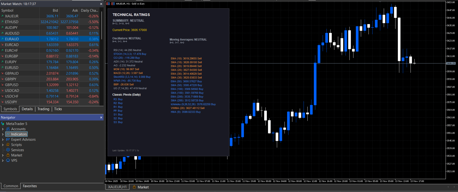 Technical Ratings analyzes multiple technical indicators simultaneously and presents their consensus as clear trading signals. Instead of opening dozens of indicator windows, you get an instant overview showing what percentage of indicators are bullish, bearish, or neutral at any given moment.