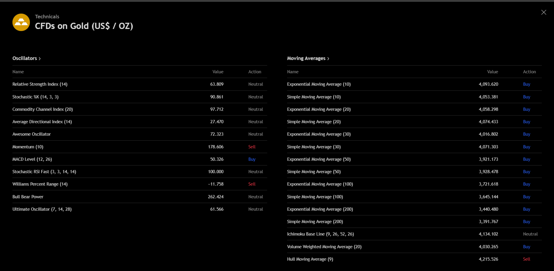 RSI generates sell signals above 70 and buy signals below 30. Stochastic uses 80 and 20 as thresholds. CCI marks overbought above 100 and oversold below -100. Williams %R signals overbought above -20 and oversold below -80. The Stochastic RSI and Ultimate Oscillator follow similar threshold logic.