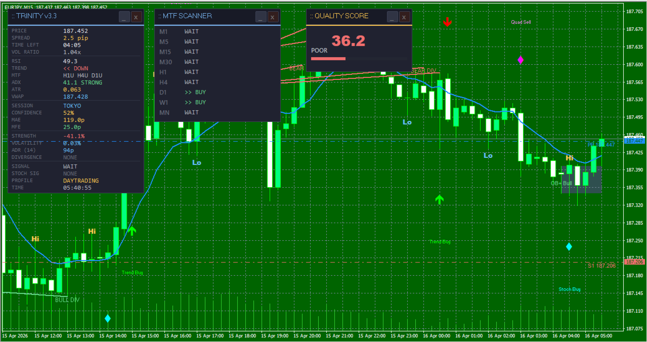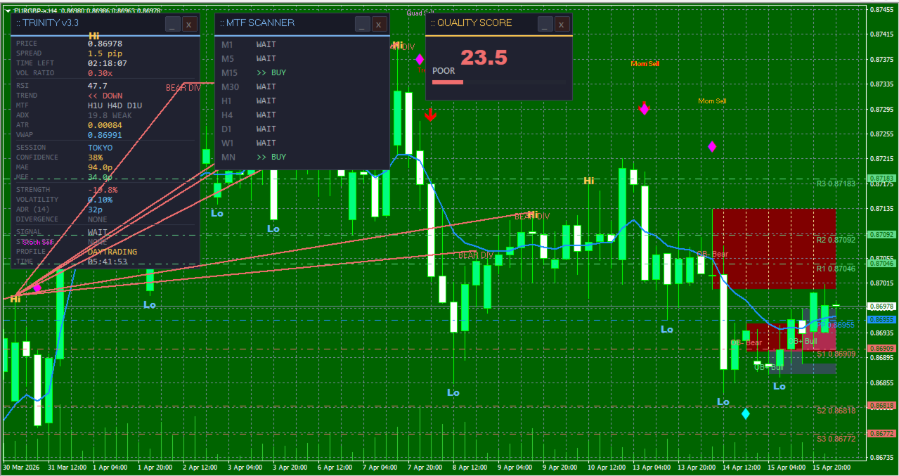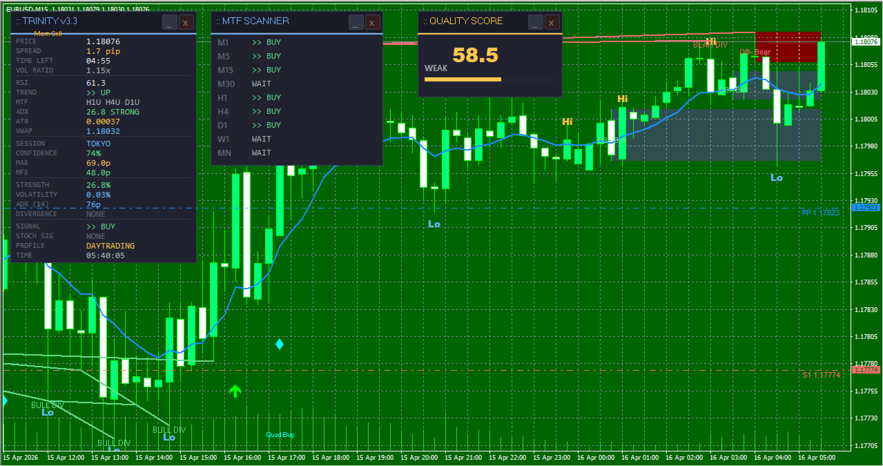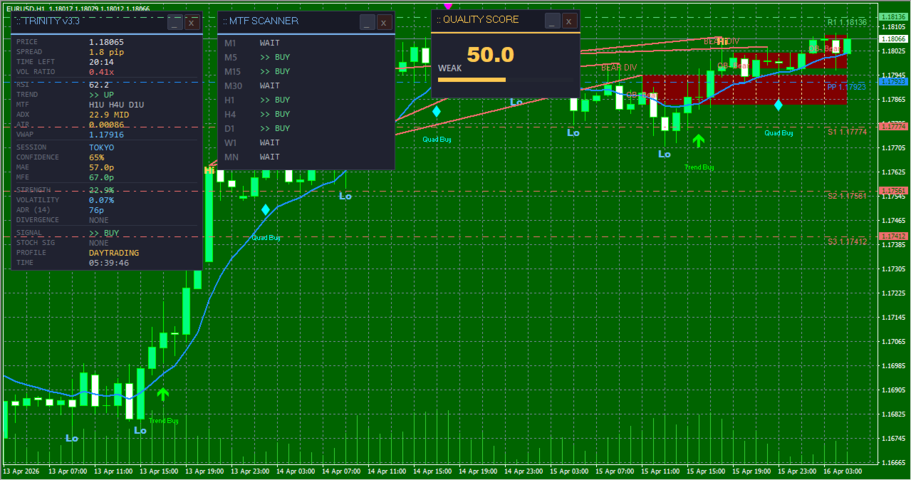 Suite Trinity v3.3 is compatible with MetaTrader 4 Build 600 and later. It operates on all instruments, all timeframes, and all broker configurations. The indicator does not place trades and functions exclusively as an analytical tool.