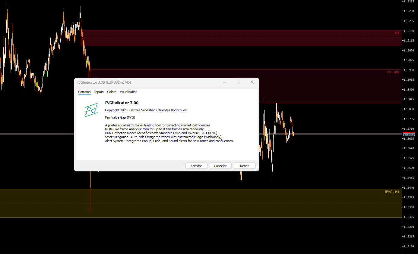 The Fair Value Gap (FVG) Indicator v3.0 is a professional tool for MetaTrader 5 designed to detect and visualize market imbalances (inefficiencies) in real time. This indicator identifies areas where the price has left liquidity gaps, which often act as price magnets or support/resistance zones.