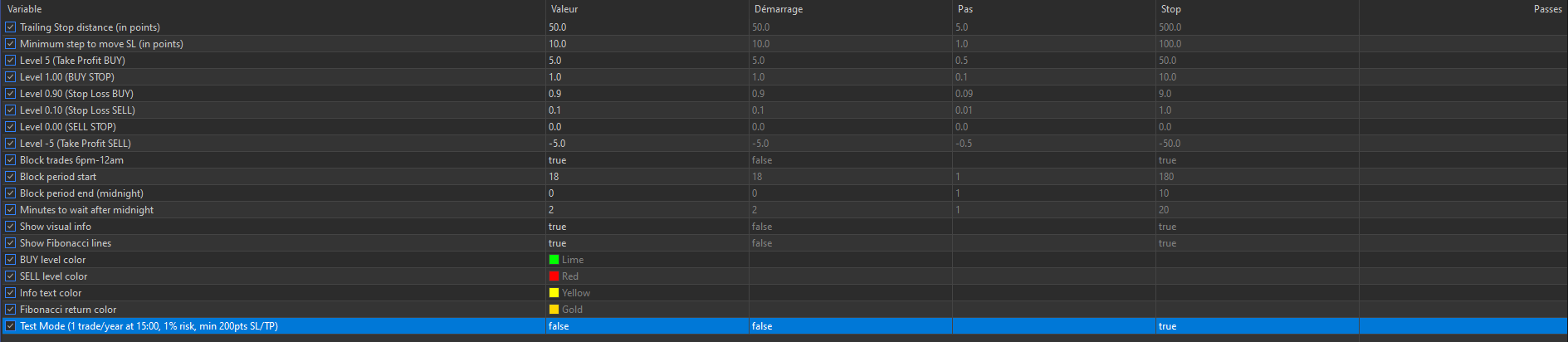 Keep Test Mode = FALSE (default) to use the full Fibonacci Daily strategy with all its features.