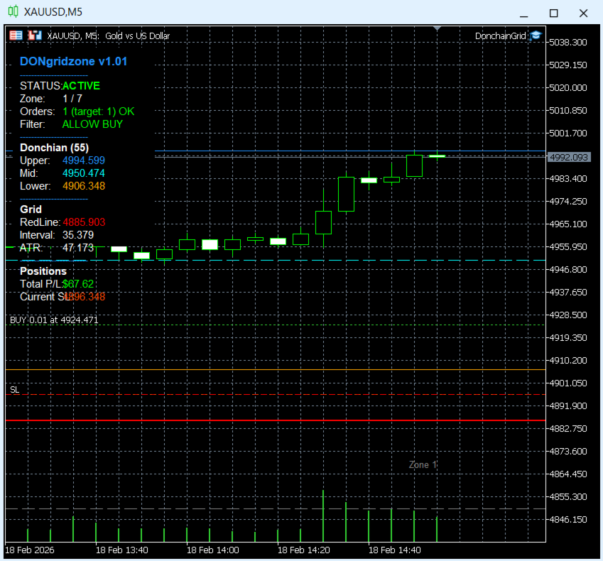 Donchain Grid Zone is a BUY-only grid trading Expert Advisor based on the Donchian Channel. It dynamically scales into positions as price drops through grid zones, and scales out as price recovers — all governed by a Donchian midline filter.