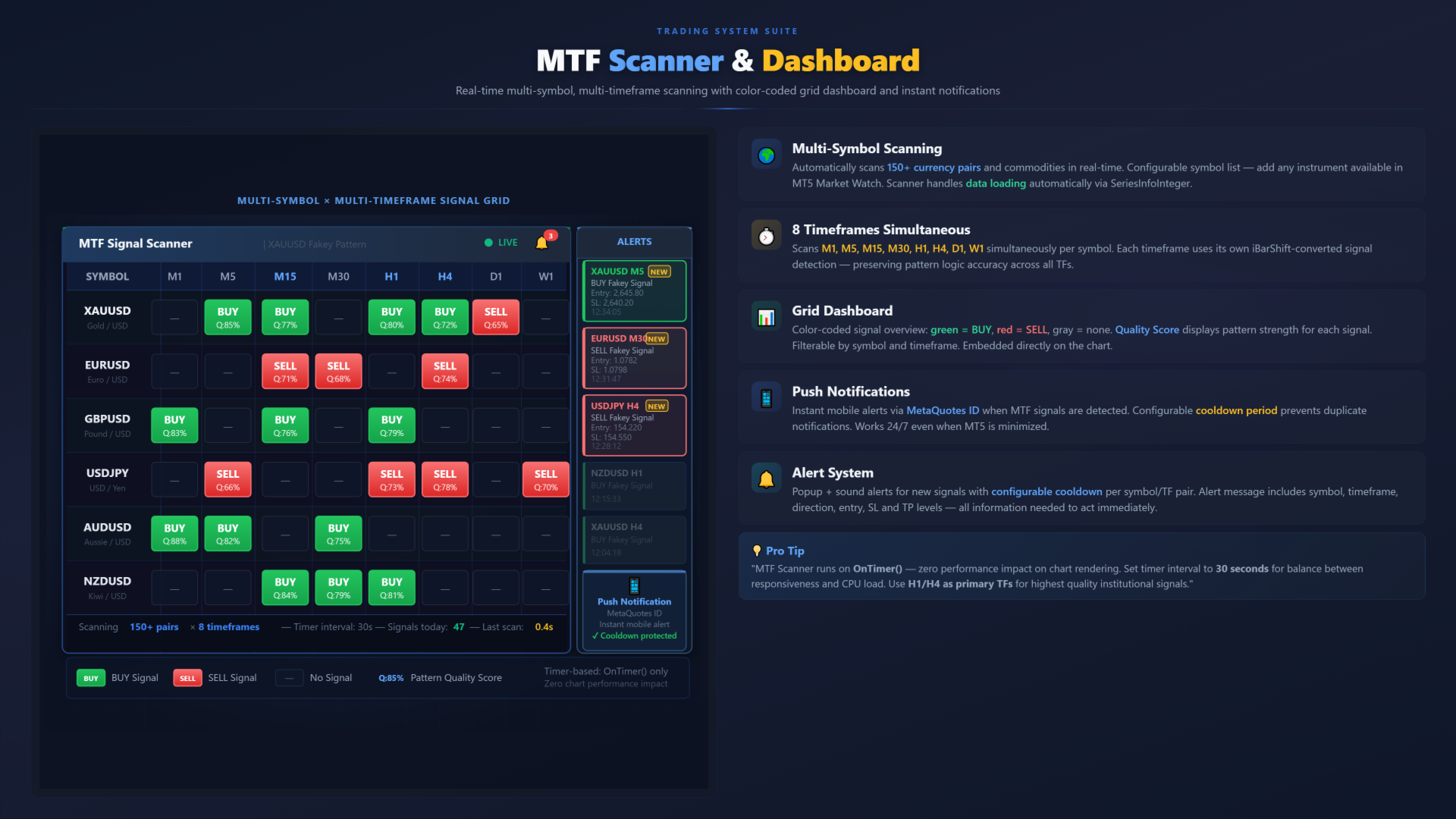 | User Guide: MTF SCAN & Dashboard User Guide | MTF SCAN automatically scans all Market Watch symbols across 8 timeframes (M1 to W1) and displays results on a Dashboard grid directly on your chart. | |||