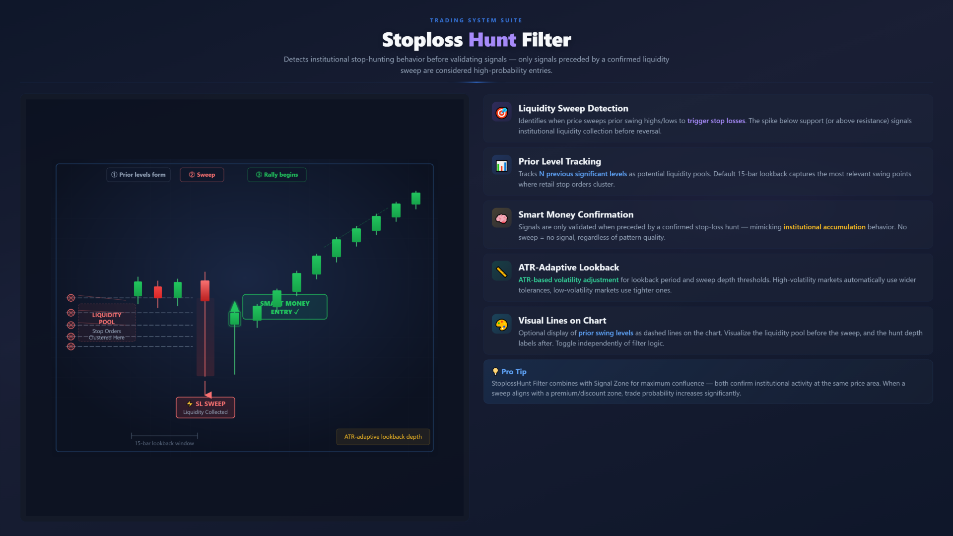 Stop Loss can be calculated using a pattern-based method, ATR-based logic, or Donchian Channel reference.