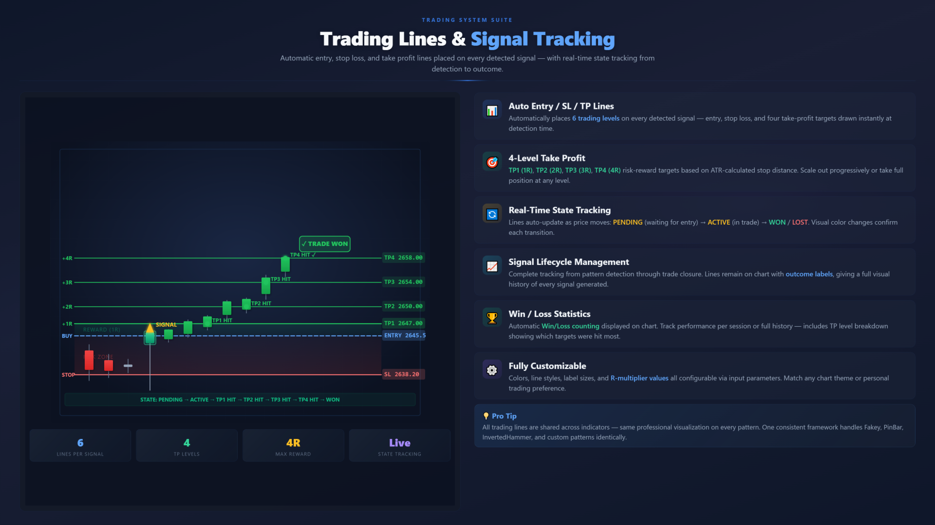| User Guide: Trading Lines & Signal Tracking System | The system automatically draws Entry, Stop Loss, and Take Profit lines (TP 1–4) on the chart, tracks price action for hits, records Win/Loss results, and displays real-time performance statistics. | |||