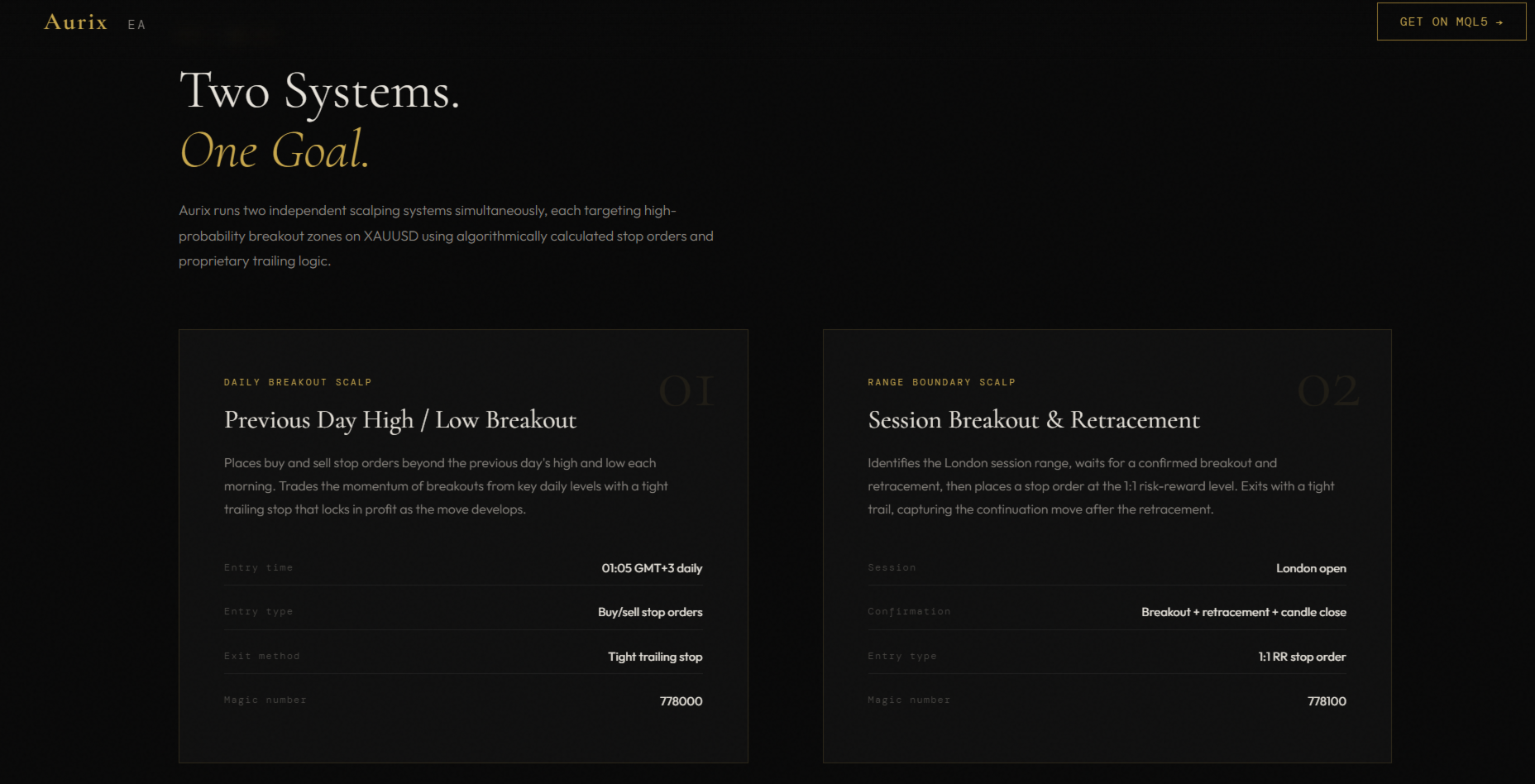 Aurix continuously monitors key price levels and identifies high-probability breakout zones across two specific trading windows — periods when scalping the gold market has been found to be most effective through extensive historical testing and optimization. When market conditions align during these windows, pending stop orders are placed at algorithmically calculated levels. A proprietary tight trailing stop activates immediately on fill. All orders are managed and cancelled automatically with no manual intervention required.