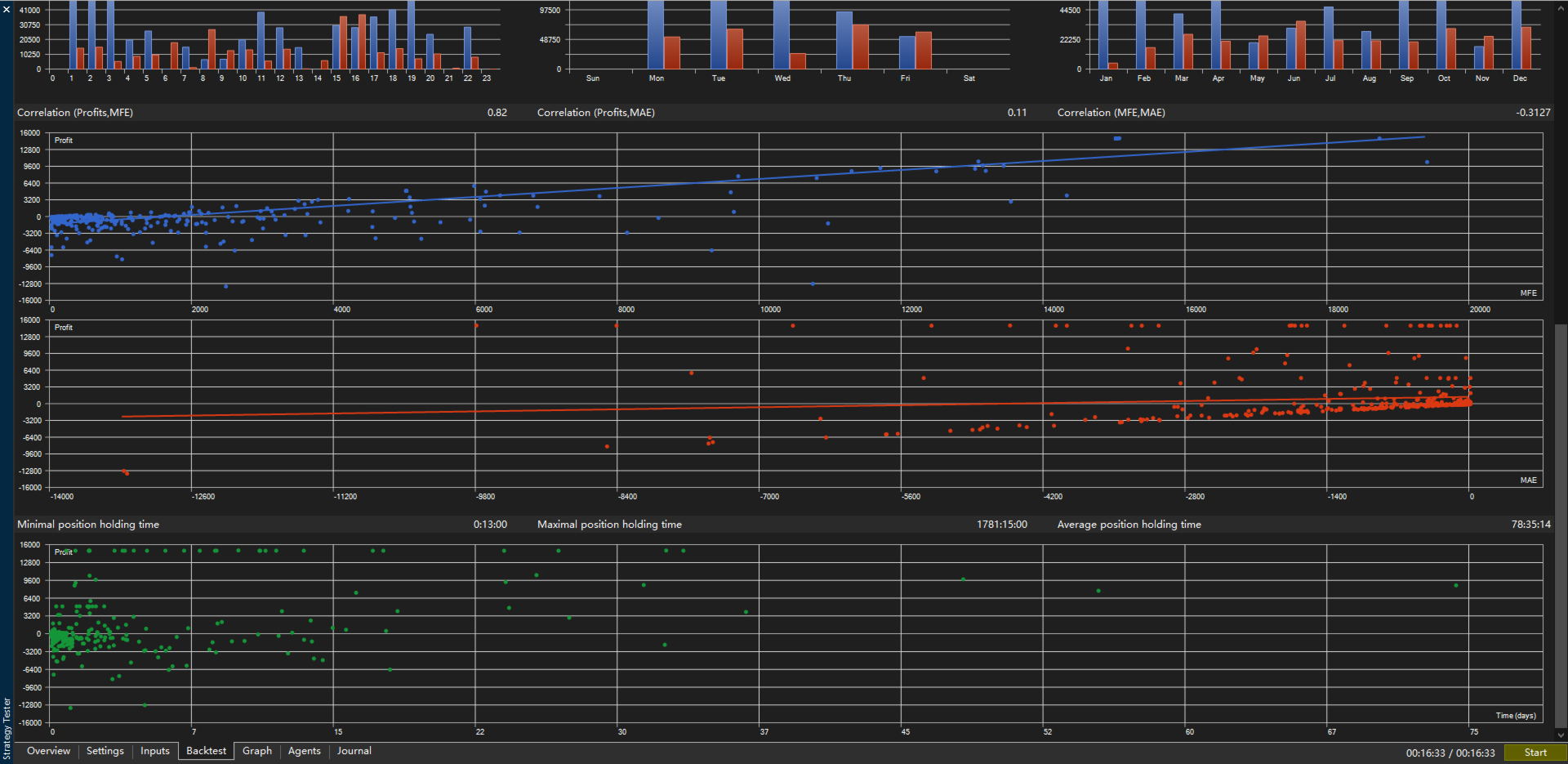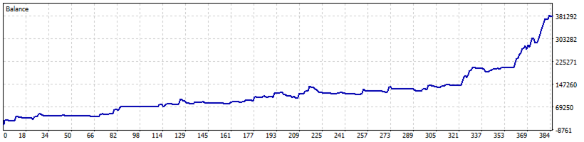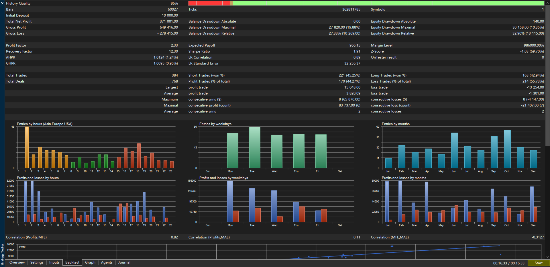 主要実績: 純利益: +371,001ドル(初期預金10,000ドルベース、37倍);プロフィットファクター: 2.33 – 1ドルの損失に対して2.33ドルの利益;シャープレシオ: 1.91 – 優れたリスク調整後パフォーマンス;最大ドローダウン: 32.90%( equity ) – 管理可能な下振れリスク;勝率: 44.27% – 低勝率・高リスクリワード戦略;総取引回数: 384回(年間約38回);平均保有時間: 78.6時間(約3.3日)。
