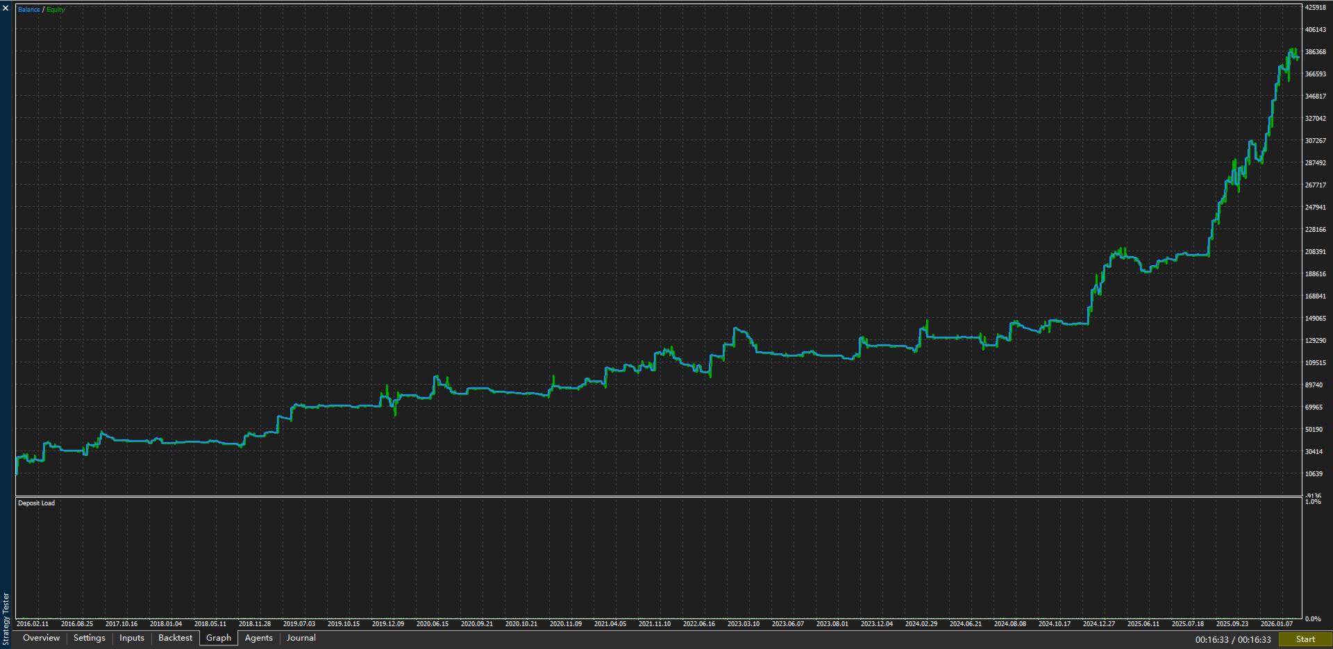 重要な注意点: 本EAは固定ロット1.0でのバックテストです。推奨最低口座サイズ:10,000ドル;勝率44.27%ですが、平均利益(3,820ドル)は平均損失(1,301ドル)の2.94倍 – 古典的な高リスクリワード・トレンドフォロー型プロファイル;最大損失:-13,254ドル(2025年12月29日の極端な値動き) – 内蔵リスク管理モジュールで1トレードあたりのリスクを制限することを検討;上昇トレンド・下降トレンドのいずれでも良好に機能。極端なレンジ相場ではドローダウンが発生する可能性あり。