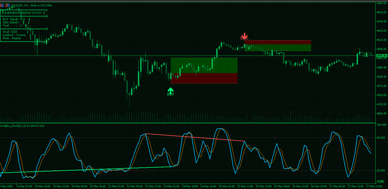 Complete visual signals: BUY/SELL arrows and labels directly on the candlesticks. Divergence lines drawn in the Stochastic subwindow connecting the detected pivots. Unambiguous, no manual interpretation required.