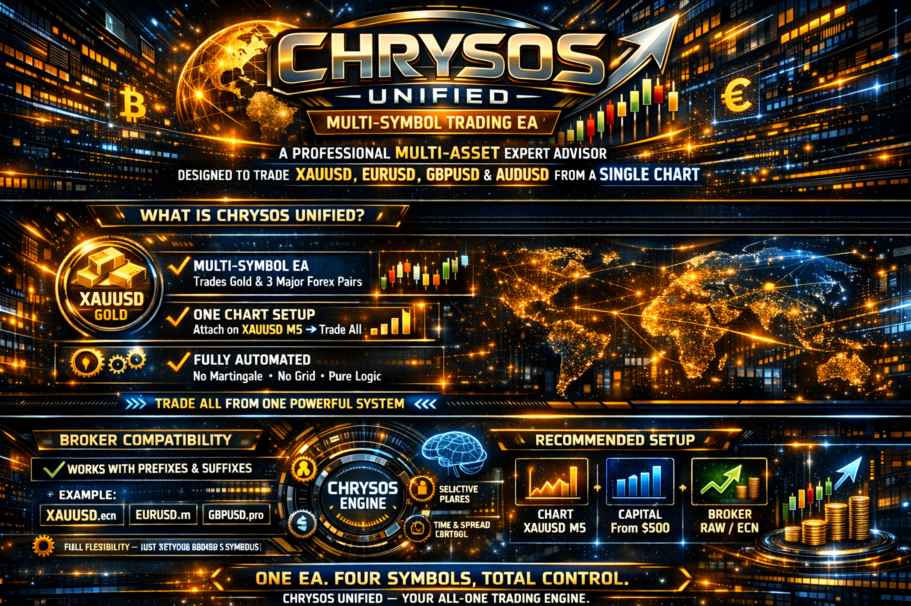 Chrysos Unified MT5 è un sistema di trading automatizzato professionale multi-simbolo progettato per negoziare XAUUSD, EURUSD, GBPUSD e AUDUSD da un unico grafico .