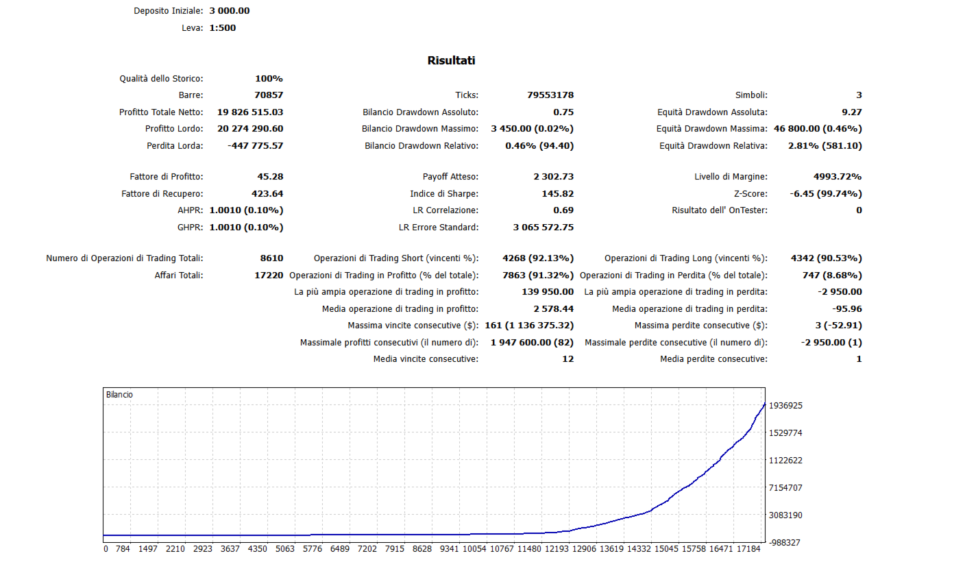 Concepito come un motore di trading strutturato e completo, combina logica di ingresso selettiva, filtri interni, gestione dinamica delle operazioni e controllo multi-asset in un unico Expert Advisor completo.