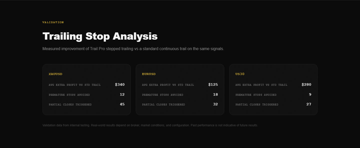 - Consistent execution — Trail Pro manages exits systematically, not emotionally