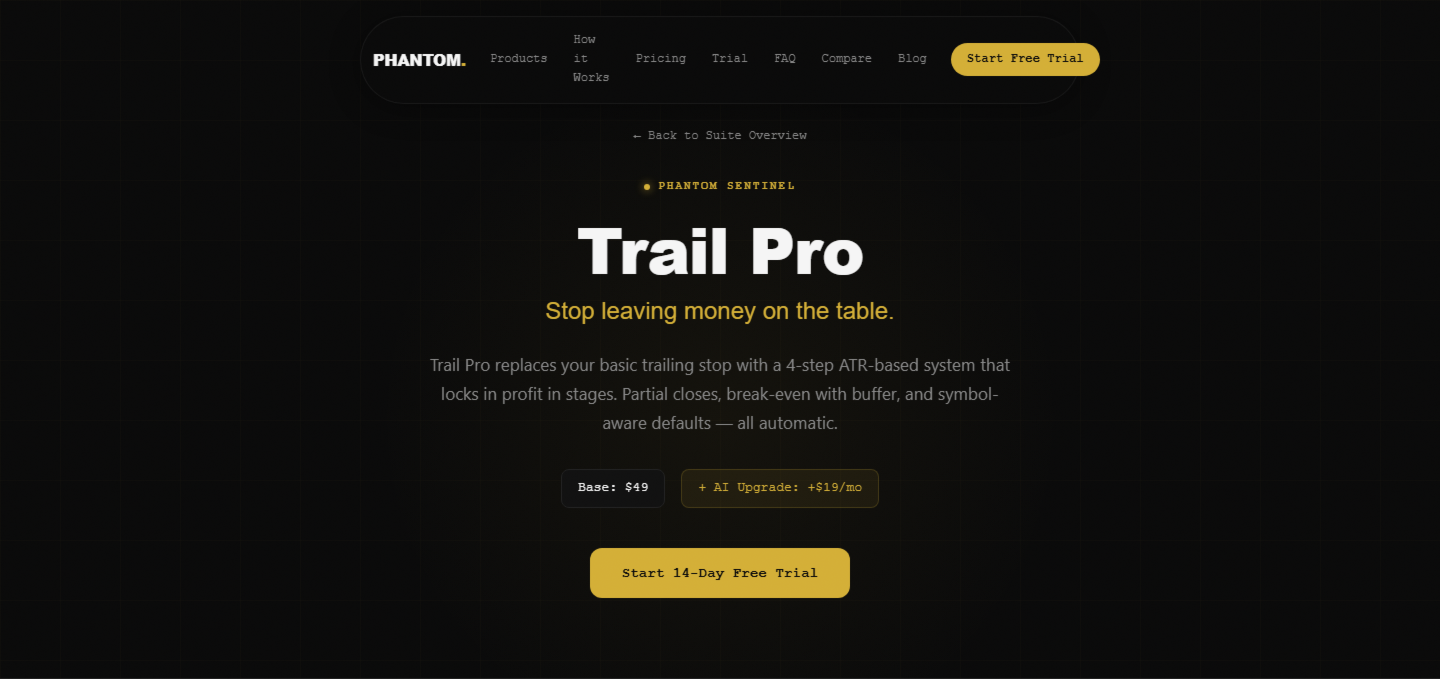 PHANTOM Trail Pro replaces standard trailing with stepped ATR-based trailing — a system that adapts to actual market volatility and gives your trades the room they need to run.
