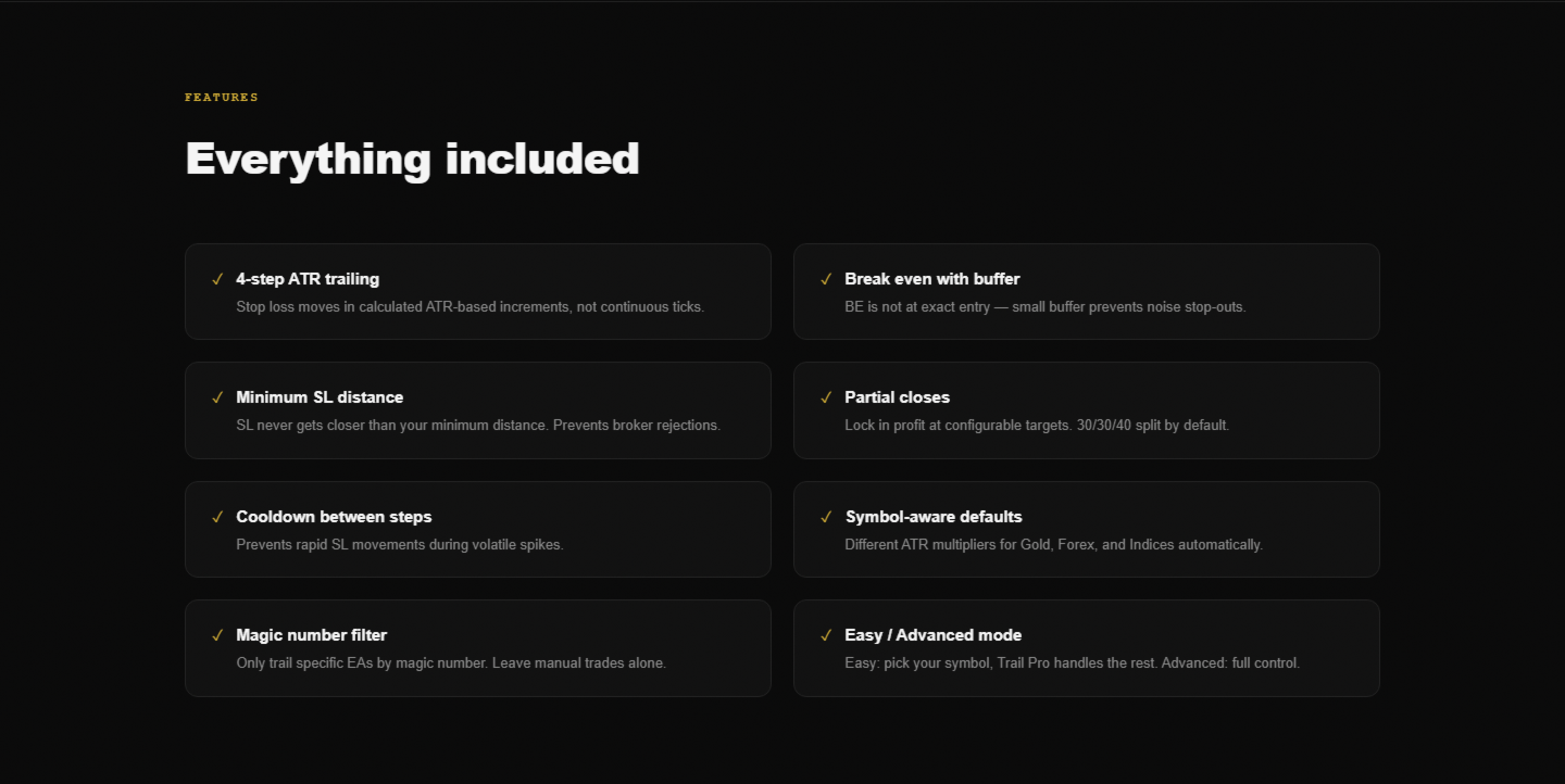 It works on your trades whether you entered manually or via an EA. No signal generation — just pure mechanical trade management done right.