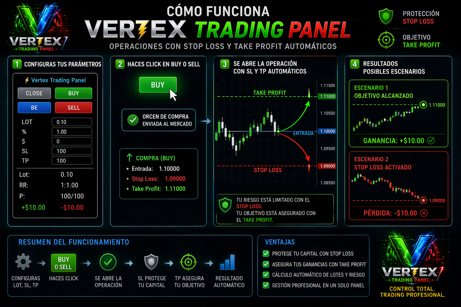 Vertex Trading Panelは、MetaTrader 4用の高度なトレーディングパネルです。チャートから直接、スピード、精度、そしてプロフェッショナルなリスク管理を求めるトレーダーのために設計されています。 モダンで洗練された直感的なインターフェースを備えたこのスクリプトを使えば、売買注文を数秒で実行し、ロットサイズを自動計算し、主要な市場情報をリアルタイムで監視できます。 🚀 主な機能 ✅ クイック実行ボタン ワンクリックで売買注文を発注できます。 ✅ 即時決済 決済ボタンで全てのポジションを即座に決済できます。 ✅ 自動損益分岐点 損益分岐点ボタンでストップロスをエントリー価格に移動することで、利益を確保できます。 ✅ インテリジェントなリスク管理 以下の基準でロットサイズを自動計算します。 リスク(%) リスク(ドル) 手動ロットサイズ ✅ カスタマイズ可能なSL/TP 市場に参入する前に、ストップロスとテイクプロフィットを簡単に設定できます。 ✅ リアルタイム情報パネル 機能: 現在のスプレッド ローソク足タイマー 利益確定 損失確定 リスクリワード比率(RR) 推定利益 推定損失 ✅ FX、インデックス、仮想通貨に対応 複数の市場に対応した自動ピップ検出システム 🎯 こんな方におすすめ: ✔ スキャルパー ✔ デイトレーダー ✔ マニュアルトレーダー ✔ 迅速なエントリー管理 ✔ MT4でのプロフェッショナルトレーディング 💎 Vertexトレーディングパネルのメリット 🔹 取引時間の短縮 🔹 リスク管理の向上 🔹 洗練された使いやすいインターフェース 🔹 手動操作ミスの削減 🔹 より速く効率的な取引 📌 必要条件 MetaTrader 4 自動売買機能対応 あらゆるMT4ブローカーに対応 重要なお知らせ: 免責事項:このエキスパートアドバイザー(EA)は、自動分析のためのテクニカルツールです。本ソフトウェアは、取引の実行のみを目的としており、金融アドバイス、投資推奨、または市場での取引への勧誘を構成するものではありません。ユーザーは、本ソフトウェアを使用して行われるすべての取引は自己責任で実行され、関連するすべてのリスクを負うことを承諾するものとします。開発者は、結果、利益、または損失の不存在を保証するものではなく、本ソフトウェアの使用または誤用から生じる直接的または間接的な金銭的損害について一切責任を負いません。