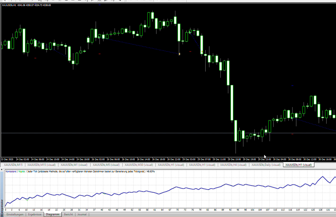 従来の自動売買ボットは、ゴールド特有の激しいボラティリティに耐えきれず失敗することがよくあります。しかし、このEAはデュアル・タイムフレーム分析(H1およびM15)を採用しています。このシナジーにより、1時間足で「大きな全体像(ビッグ・ピクチャー)」を把握しながら、的確なエントリーを可能にします。