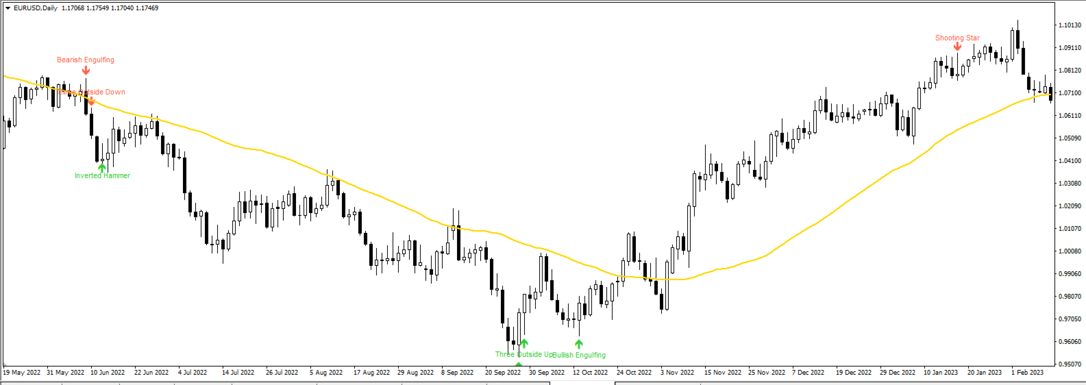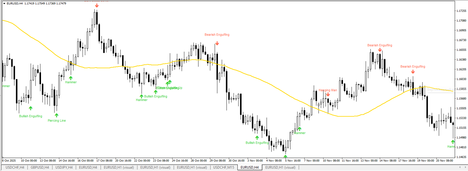 The filter helps detect bullish reversal patterns after downward movement and bearish reversal patterns after upward movement. This makes the signals more consistent with classical Japanese candlestick analysis.