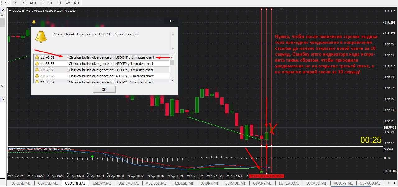 Здравствуйте! У меня не сложная задача! Уточните пожалуйста, вы можете исправить ошибку в индикаторе? Мне нужна, чтобы после появления стрелки индикатора в терминале мт4 приходило уведомление в направления стрелки до начала открытие новой свечи за 10 секунд. Ошибку этого индикатора надо исправить таким образом, чтобы приходила уведомления не на открытие третьей свечи, а-на открытие свечи второй после появления стрелки на следующий свече за 10 секунд до открытия! Мне нужна, чтобы алгоритм индикатора не нарушился и не перерисовывался работал как оригинал индикатора.