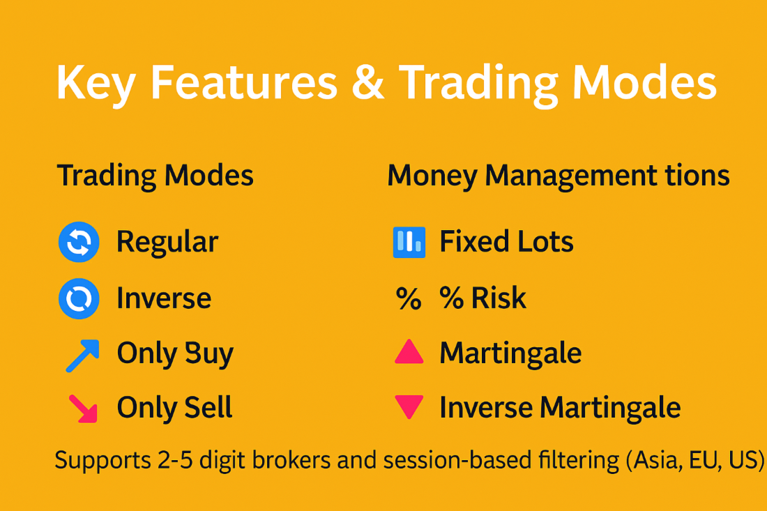 Additionally, the EA implements four money management modes: