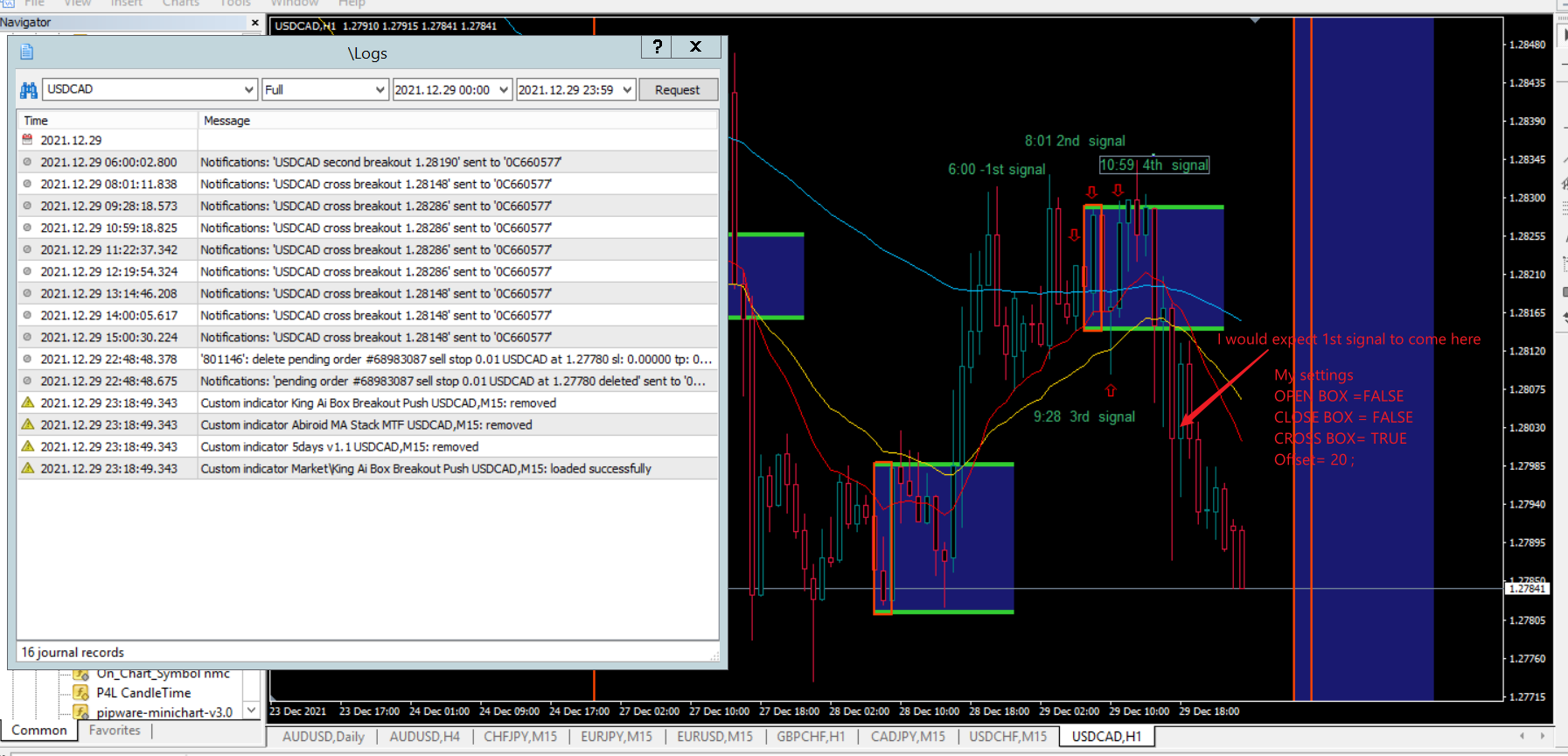 Hi. Probably the best idea but indicator does not work anymore as intended. Please update the indicator. The offset setting is not acting at all as an offset. When testing the signals are ok , but in real account the amount of signals is overwhelming this rendering the purpose of the notifications inutile. When I set the indicator to Cross breakout and offset to 10 I would expect the signal to come after 10 pips and after closing outside the box entirely Am I wrong?
