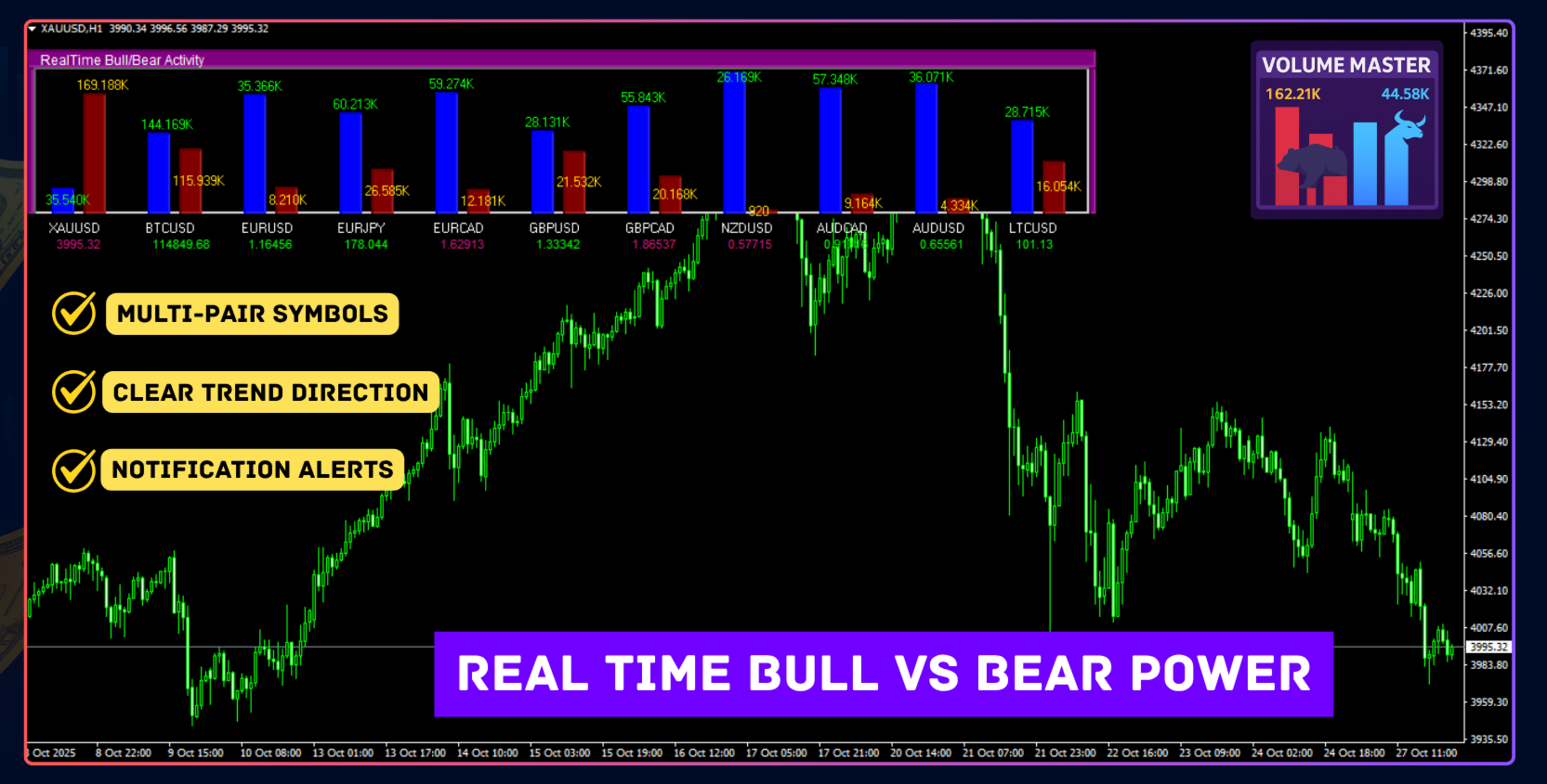 Volume Master is a powerful trading tool designed to give you a clear edge by visualizing bull vs bear activity across multiple symbols, while helping you confirm high-probability entries directly on your chart.