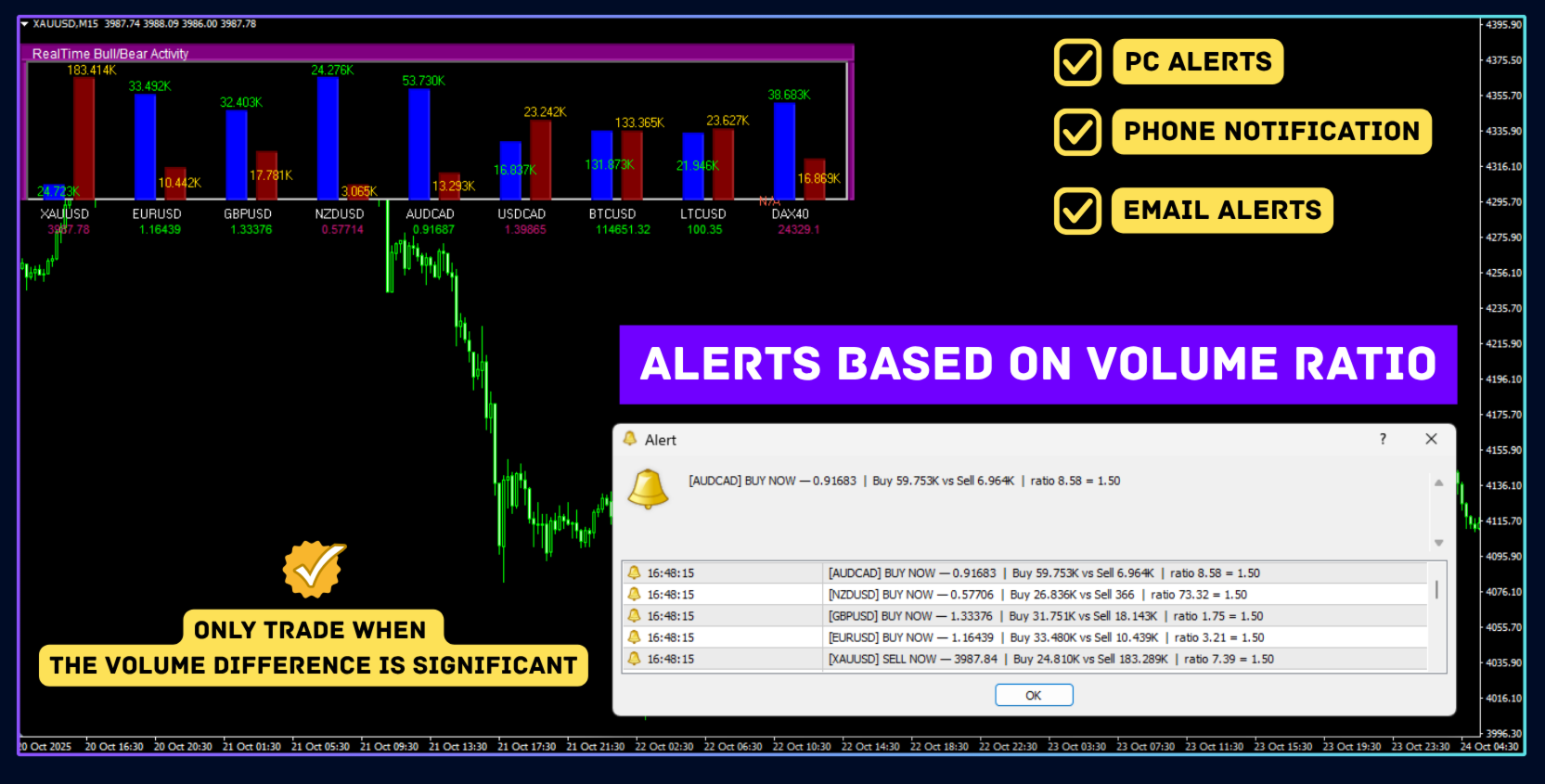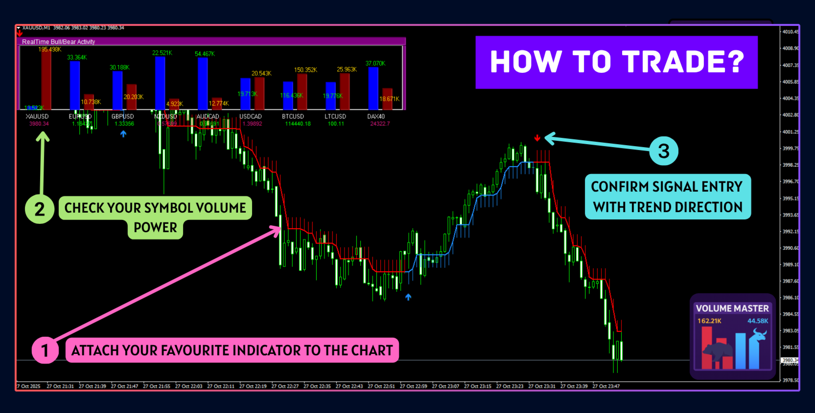 Unlike traditional volume indicators, Volume Master doesn’t just show volume — it shows market dominance.