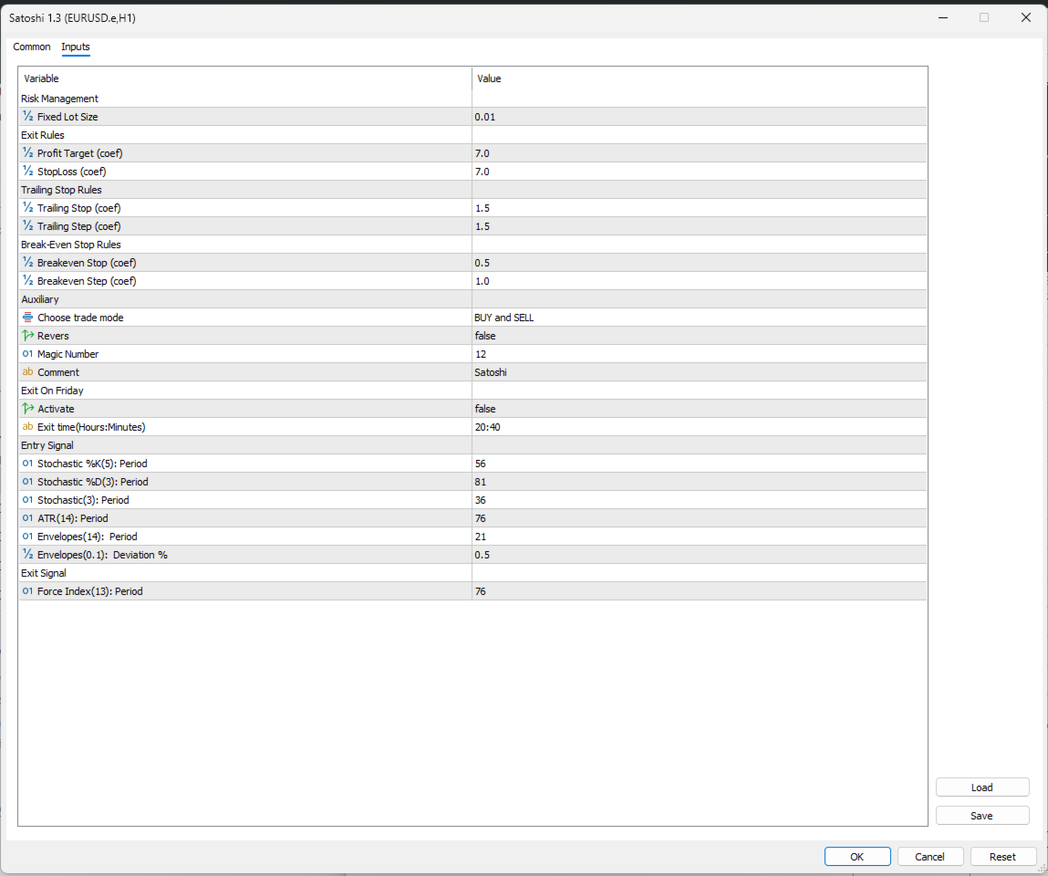 The Satoshi EA is a powerful and adaptable Expert Advisor (EA) for MetaTrader 5, crafted to deliver consistent and precise trading performance. Designed for seamless operation on a Virtual Private Server (VPS), Satoshi EA ensures uninterrupted trading with minimal latency. Leveraging a robust combination of technical indicators—including Stochastic, ATR, and Envelopes for entry signals, and Force Index for exit signals—this EA offers traders a flexible platform to automate their strategies. With advanced money management, trailing stops, break-even stops, and unique features like Friday exit rules, Satoshi EA is ideal for traders seeking reliability and customization.