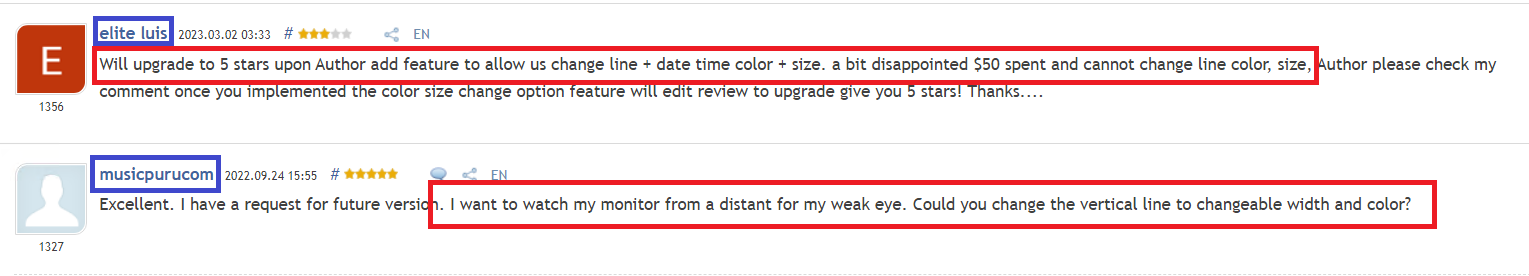 see dear Author, many customer has request, please help add the 5x field options to allow us change the line and date/time color + size ok? just half a day job and you would save our eye from having to strain and look hard on the monitor screen... please help ok?